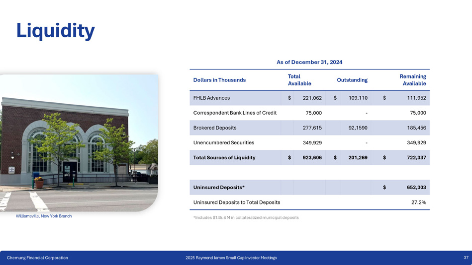 2025 Raymond James Small Cap Investor Meetings Chemung Financial Corporation $1,686.3 $1,738.0 $1,815.5 $1,899.8 $1,892.2 $351.4 $415.6 $435.2 $381.0 $399.4 $73.5 $142.8 $92.2 $1.8 $3.0 $5.8 $13.1 32.0% 33.6% 30.1% 27.0% 27.2% 0.0% 10.0% 20.0% 30.0% 40.0% 50.0% 60.0% 70.0% 80.0% 90.0% 100.0% $- $500 $1,000 $1,500 $2,000 $2,500 $3,000 2020 2021 2022 2023 2024 Deposits by Division ($ Millions) CCTC Capital Bank Brokered Western New York Uninsured Deposits Deposit Composition 36 *CAGR 12/31/2019 to 12/31/2024 *December 31, 2024 figures unaudited.