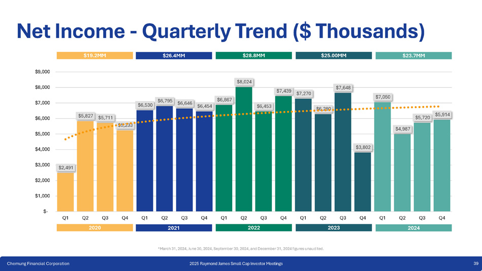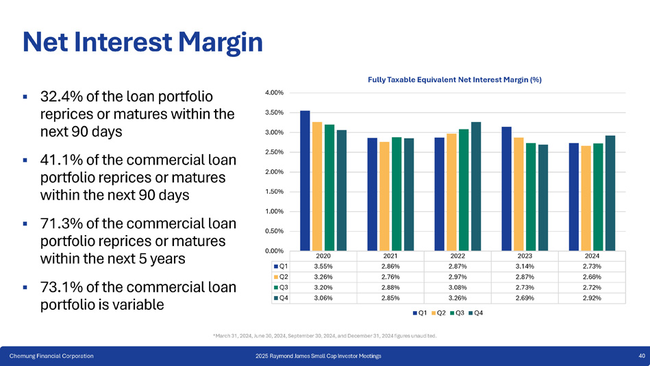 2025 Raymond James Small Cap Investor Meetings Chemung Financial Corporation Liquidity 37 Williamsville, New York Branch Remaining Available Outstanding Total Available Dollars in Thousands 111,952 $ 109,110 $ 221,062 $ FHLB Advances 75,000 - 75,000 Correspondent Bank Lines of Credit 185,456 92,1590 277,615 Brokered Deposits 349,929 - 349,929 Unencumbered Securities 722,337 $ 201,269 $ 923,606 $ Total Sources of Liquidity 652,303 $ Uninsured Deposits* 27.2% Uninsured Deposits to Total Deposits *Includes $145.6 M in collateralized municipal deposits 2025 Raymond James Small Cap Investor Meetings As of December 31, 2024 Chemung Financial Corporation $2,491 $5,827 $5,711 $5,233 $6,530 $6,795 $6,646 $6,454 $6,867 $8,024 $6,453 $7,439 $7,270 $6,280 $7,648 $3,802 $7,050 $4,987 $5,720 $5,914 $- $1,000 $2,000 $3,000 $4,000 $5,000 $6,000 $7,000 $8,000 $9,000 Q1 Q2 Q3 Q4 Q1 Q2 Q3 Q4 Q1 Q2 Q3 Q4 Q1 Q2 Q3 Q4 Q1 Q2 Q3 Q4 Net Income - Quarterly Trend ($ Thousands) 39 *March 31, 2024, June 30, 2024, September 30, 2024, and December 31, 2024 figures unaudited.