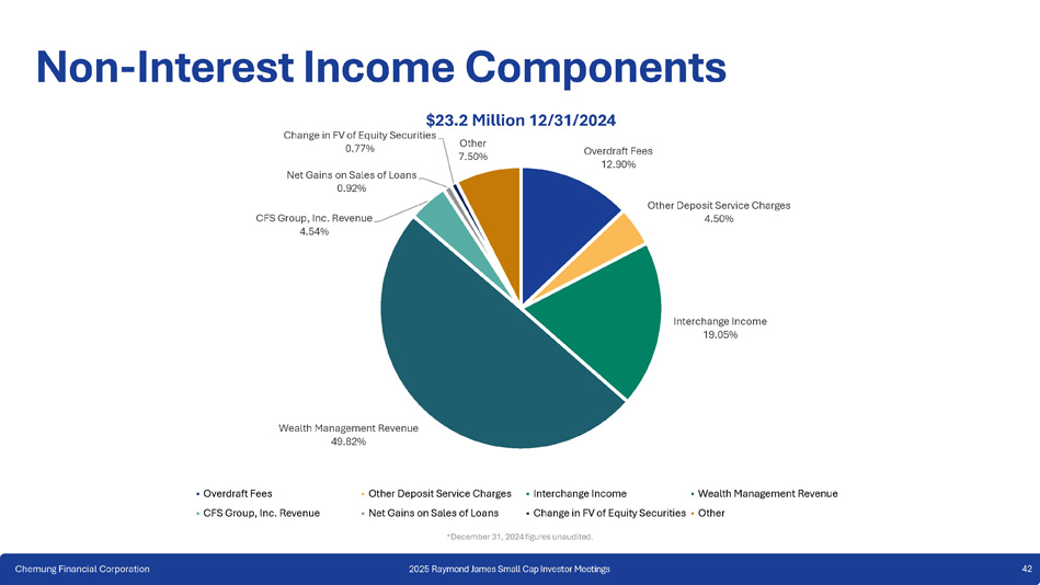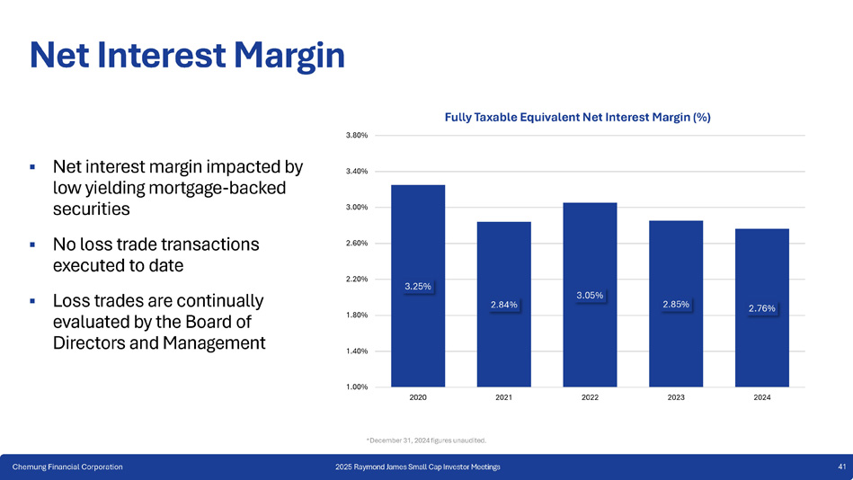 2025 Raymond James Small Cap Investor Meetings $19.2MM $26.4MM $28.8MM $25.00MM $23.7MM 2020 2021 2022 2023 2024 Chemung Financial Corporation 2020 2021 2022 2023 2024 Q1 3.55% 2.86% 2.87% 3.14% 2.73% Q2 3.26% 2.76% 2.97% 2.87% 2.66% Q3 3.20% 2.88% 3.08% 2.73% 2.72% Q4 3.06% 2.85% 3.26% 2.69% 2.92% 0.00% 0.50% 1.00% 1.50% 2.00% 2.50% 3.00% 3.50% 4.00% Fully Taxable Equivalent Net Interest Margin (%) Q1 Q2 Q3 Q4 Net Interest Margin 40 *March 31, 2024, June 30, 2024, September 30, 2024, and December 31, 2024 figures unaudited. ▪ 32.4% of the loan portfolio reprices or matures within the next 90 days ▪ 41.1% of the commercial loan portfolio reprices or matures within the next 90 days ▪ 71.3% of the commercial loan portfolio reprices or matures within the next 5 years ▪ 73.1% of the commercial loan portfolio is variable 2025 Raymond James Small Cap Investor Meetings Chemung Financial Corporation 3.25% 2.84% 3.05% 2.85% 2.76% 1.00% 1.40% 1.80% 2.20% 2.60% 3.00% 3.40% 3.80% 2020 2021 2022 2023 2024 Fully Taxable Equivalent Net Interest Margin (%) Net Interest Margin 41 ▪ Net interest margin impacted by low yielding mortgage - backed securities ▪ No loss trade transactions executed to date ▪ Loss trades are continually evaluated by the Board of Directors and Management *December 31, 2024 figures unaudited.