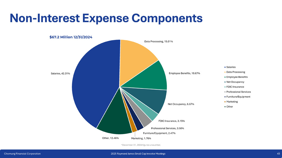 2025 Raymond James Small Cap Investor Meetings Chemung Financial Corporation Overdraft Fees 12.90% Other Deposit Service Charges 4.50% Interchange Income 19.05% Wealth Management Revenue 49.82% CFS Group, Inc. Revenue 4.54% Net Gains on Sales of Loans 0.92% Change in FV of Equity Securities 0.77% Other 7.50% $23.2 Million 12/31/2024 Overdraft Fees Other Deposit Service Charges Interchange Income Wealth Management Revenue CFS Group, Inc. Revenue Net Gains on Sales of Loans Change in FV of Equity Securities Other Non - Interest Income Components 42 *December 31, 2024 figures unaudited.