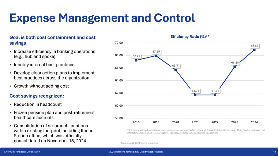 2025 Raymond James Small Cap Investor Meetings Chemung Financial Corporation Salaries , 42.31% Data Processing , 15.01% Employee Benefits , 10.67% Net Occupancy , 8.67% FDIC Insurance , 3.15% Professional Services , 3.50% Furniture/Equipment , 2.47% Marketing , 1.76% Other , 12.46% $67.2 Million 12/31/2024 Salaries Data Processing Employee Benefits Net Occupancy FDIC Insurance Professional Services Furniture/Equipment Marketing Other Non - Interest Expense Components 43 *December 31, 2024 figures unaudited.