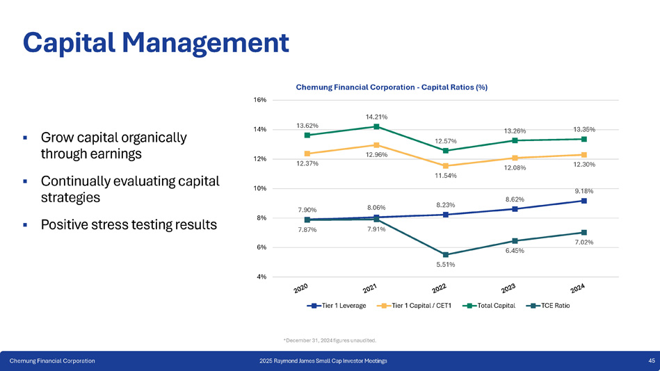 2025 Raymond James Small Cap Investor Meetings Chemung Financial Corporation 67.22 67.95 65.71 61.71 61.71 66.20 68.89 58.00 60.00 62.00 64.00 66.00 68.00 70.00 2018 2019 2020 2021 2022 2023 2024 Efficiency Ratio (%)** Expense Management and Control 44 Goal is both cost containment and cost savings ▪ Increase efficiency in banking operations (e.g., hub and spoke) ▪ Identify internal best practices ▪ Develop clear action plans to implement best practices across the organization ▪ Growth without adding cost Cost savings recognized: ▪ Reduction in headcount ▪ Frozen pension plan and post - retirement healthcare accruals ▪ Consolidation of six branch locations within existing footprint including Ithaca Station office, which was officially consolidated on November 15, 2024 **Efficiency ratio (adjusted) is non - interest expense less amortization of intangible assets divided by the total of fully taxab le equivalent net interest income plus non - interest income less net gains or losses on securities transactions *December 31, 2024 figures unaudited.