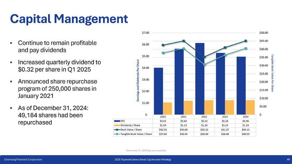 2025 Raymond James Small Cap Investor Meetings Chemung Financial Corporation 7.90% 8.06% 8.23% 8.62% 9.18% 12.37% 12.96% 11.54% 12.08% 12.30% 13.62% 14.21% 12.57% 13.26% 13.35% 7.87% 7.91% 5.51% 6.45% 7.02% 4% 6% 8% 10% 12% 14% 16% Chemung Financial Corporation - Capital Ratios (%) Tier 1 Leverage Tier 1 Capital / CET1 Total Capital TCE Ratio Capital Management 45 ▪ Grow capital organically through earnings ▪ Continually evaluating capital strategies ▪ Positive stress testing results *December 31, 2024 figures unaudited.