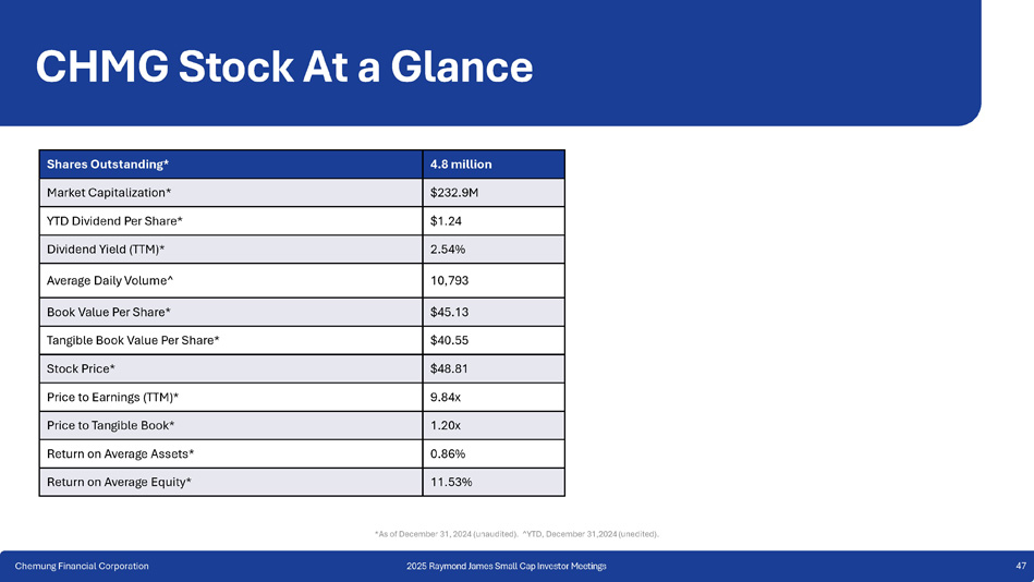 2025 Raymond James Small Cap Investor Meetings Chemung Financial Corporation 2020 2021 2022 2023 2024 EPS $4.01 $5.64 $6.13 $5.28 $4.96 Dividends / Share $1.04 $1.19 $1.24 $1.24 $1.24 Book Value / Share $42.53 $45.09 $35.32 $41.07 $45.13 Tangible Book Value / Share $37.83 $40.44 $30.69 $36.48 $40.55 $- $1.00 $2.00 $3.00 $4.00 $5.00 $6.00 $7.00 $- $5.00 $10.00 $15.00 $20.00 $25.00 $30.00 $35.00 $40.00 $45.00 $50.00 Earnings and Dividends Per Share Tangible Book Value Per Share Capital Management 46 ▪ Continue to remain profitable and pay dividends ▪ Increased quarterly dividend to $0.32 per share in Q1 2025 ▪ Announced share repurchase program of 250,000 shares in January 2021 ▪ As of December 31, 2024: 49,184 shares had been repurchased 2025 Raymond James Small Cap Investor Meetings *December 31, 2024 figures unaudited.