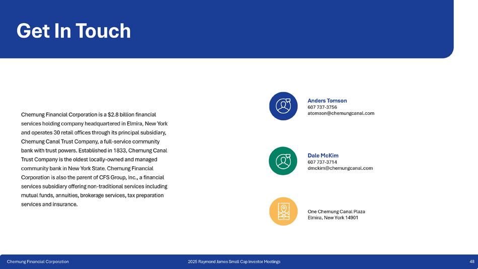 47 2025 Raymond James Small Cap Investor Meetings Chemung Financial Corporation One Chemung Canal Plaza Elmira, New York 14901 Anders Tomson 607 737 - 3756 atomson@chemungcanal.com Get In Touch Chemung Financial Corporation is a $2.8 billion financial services holding company headquartered in Elmira, New York and operates 30 retail offices through its principal subsidiary, Chemung Canal Trust Company, a full - service community bank with trust powers. Established in 1833, Chemung Canal Trust Company is the oldest locally - owned and managed community bank in New York State. Chemung Financial Corporation is also the parent of CFS Group, Inc., a financial services subsidiary offering non - traditional services including mutual funds, annuities, brokerage services, tax preparation services and insurance. Dale McKim 607 737 - 3714 dmckim@chemungcanal.com 48 2025 Raymond James Small Cap Investor Meetings