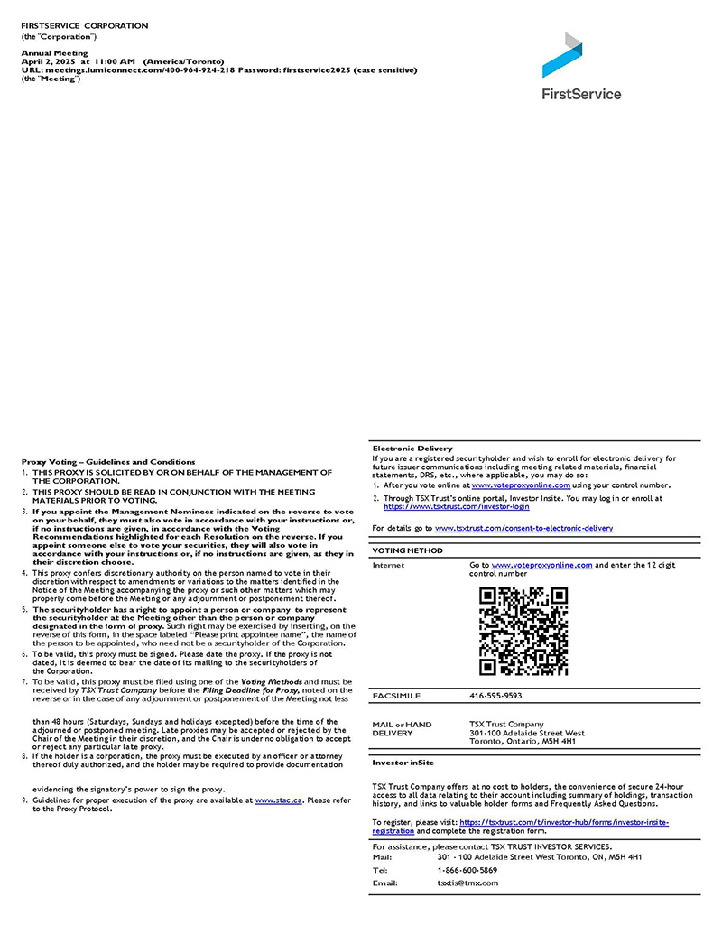 FIRSTSERVICE CORPORATION (the " Corporation ") Annual Meeting April 2, 2025 at 11:00 AM (America/Toronto) URL: meetings.lumiconnect.com/400 - 964 - 924 - 218 Password: firstservice2025 (case sensitive) (the " Meeting ") Proxy Voting – Guidelines and Conditions 1. THIS PROXY IS SOLICITED BY OR ON BEHALF OF THE MANAGEMENT OF THE CORPORATION. 2. THIS PROXY SHOULD BE READ IN CONJUNCTION WITH THE MEETING MATERIALS PRIOR TO VOTING. 3. If you appoint the Management Nominees indicated on the reverse to vote on your behalf, they must also vote in accordance with your instructions or, if no instructions are given, in accordance with the Voting Recommendations highlighted for each Resolution on the reverse. If you appoint someone else to vote your securities, they will also vote in accordance with your instructions or, if no instructions are given, as they in their discretion choose. 4. This proxy confers discretionary authority on the person named to vote in their discretion with respect to amendments or variations to the matters identified in the Notice of the Meeting accompanying the proxy or such other matters which may properly come before the Meeting or any adjournment or postponement thereof. 5. The securityholder has a right to appoint a person or company to represent the securityholder at the Meeting other than the person or company designated in the form of proxy. Such right may be exercised by inserting, on the reverse of this form, in the space labeled “Please print appointee name”, the name of the person to be appointed, who need not be a securityholder of the Corporation. 6. To be valid, this proxy must be signed. Please date the proxy. If the proxy is not dated, it is deemed to bear the date of its mailing to the securityholders of the Corporation. 7. To be valid, this proxy must be filed using one of the Voting Methods and must be received by TSX Trust Company before the Filing Deadline for Proxy, noted on the reverse or in the case of any adjournment or postponement of the Meeting not less Electronic Delivery If you are a registered securityholder and wish to enroll for electronic delivery for future issuer communications including meeting related materials, financial statements, DRS, etc., where applicable, you may do so: 1. After you vote online at www.voteproxyonline.com using your control number. 2. Through TSX Trust’s online portal, Investor Insite. You may log in or enroll at https://www.tsxtrust.com/investor - login For details go to www.tsxtrust.com/consent - to - electronic - delivery VOTING METHOD Internet Go to www.voteproxyonline.com and enter the 12 digit control number FACSIMILE 416 - 595 - 9593 than 48 hours (Saturdays, Sundays and holidays excepted) before the time of the adjourned or postponed meeting. Late proxies may be accepted or rejected by the Chair of the Meeting in their discretion, and the Chair is under no obligation to accept or reject any particular late proxy. 8. If the holder is a corporation, the proxy must be executed by an officer or attorney thereof duly authorized, and the holder may be required to provide documentation MAIL or HAND DELIVERY Investor inSite TSX Trust Company 301 - 100 Adelaide Street West Toronto, Ontario, M5H 4H1 evidencing the signatory’s power to sign the proxy. 9. Guidelines for proper execution of the proxy are available at www.stac.ca . Please refer to the Proxy Protocol. TSX Trust Company offers at no cost to holders, the convenience of secure 24 - hour access to all data relating to their account including summary of holdings, transaction history, and links to valuable holder forms and Frequently Asked Questions. To register, please visit: https://tsxtrust.com/t/investor - hub/forms/investor - insite - registration and complete the registration form. For assistance, please contact TSX TRUST INVESTOR SERVICES.