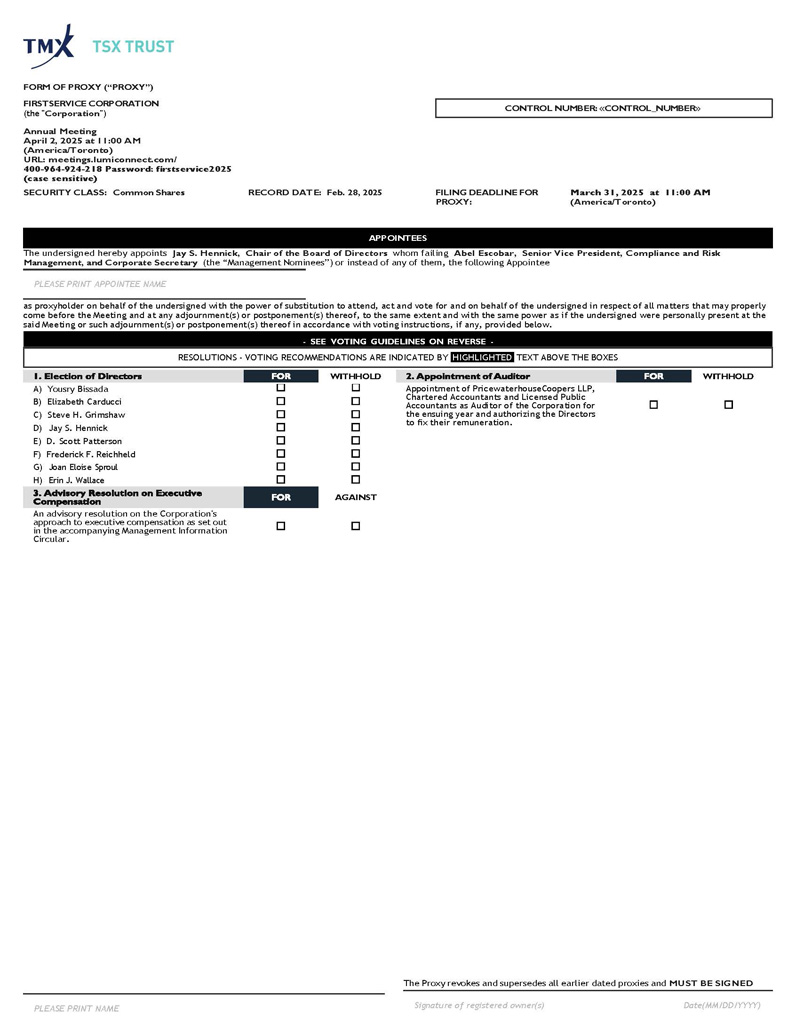 Mail: Tel: Email: 301 - 100 Adelaide Street West Toronto, ON, M5H 4H1 1 - 866 - 600 - 5869 tsxtis@tmx.com FORM OF PROXY (“PROXY”) FIRSTSERVICE CORPORATION (the " Corporation ") Annual Meeting April 2, 2025 at 11:00 AM (America/Toronto) URL: meetings.lumiconnect.com/ 400 - 964 - 924 - 218 Password: firstservice2025 (case sensitive) SECURITY CLASS: Common Shares RECORD DATE: Feb. 28, 2025 FILING DEADLINE FOR PROXY: March 31, 2025 at 11:00 AM (America/Toronto) The undersigned hereby appoints Jay S. Hennick, Chair of the Board of Directors whom failing Abel Escobar, Senior Vice President, Compliance and Risk Management, and Corporate Secretary (the “Management Nominees”) or instead of any of them, the following Appointee PLEASE PRINT APPOINTEE NAME as proxyholder on behalf of the undersigned with the power of substitution to attend, act and vote for and on behalf of the undersigned in respect of all matters that may properly come before the Meeting and at any adjournment(s) or postponement(s) thereof, to the same extent and with the same power as if the undersigned were personally present at the said Meeting or such adjournment(s) or postponement(s) thereof in accordance with voting instructions, if any, provided below . A) Yousry Bissada B) Elizabeth Carducci C) Steve H. Grimshaw D) Jay S. Hennick E) D. Scott Patterson F) Frederick F. Reichheld G) Joan Eloise Sproul H) Erin J. Wallace An advisory resolution on the Corporation's approach to executive compensation as set out in the accompanying Management Information Circular. WITHHOLD AGAINST Appointment of PricewaterhouseCoopers LLP, Chartered Accountants and Licensed Public Accountants as Auditor of the Corporation for the ensuing year and authorizing the Directors to fix their remuneration. WITHHOLD PLEASE PRINT NAME The Proxy revokes and supersedes all earlier dated proxies and MUST BE SIGNED Signature of registered owner(s) Date(MM/DD/YYYY) APPOINTEES - SEE VOTING GUIDELINES ON REVERSE - RESOLUTIONS - VOTING RECOMMENDATIONS ARE INDICATED BY HIGHLIGHTED TEXT ABOVE THE BOXES CONTROL NUMBER: «CONTROL_NUMBER»