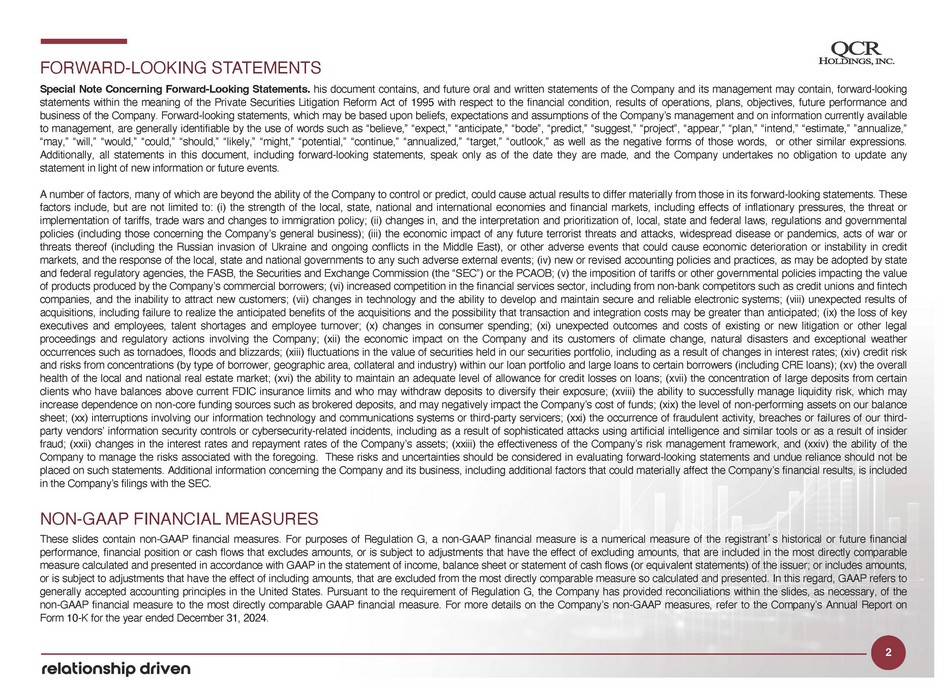 FORWARD - LOOKING STATEMENTS Special Note Concerning Forward - Looking Statements . his document contains, and future oral and written statements of the Company and its management may contain, forward - looking statements within the meaning of the Private Securities Litigation Reform Act of 1995 with respect to the financial condition, results of operations, plans, objectives, future performance and business of the Company . Forward - looking statements, which may be based upon beliefs, expectations and assumptions of the Company’s management and on information currently available to management, are generally identifiable by the use of words such as “believe,” “expect,” “anticipate,” “bode”, “predict,” “suggest,” “project”, “appear,” “plan,” “intend,” “estimate,” ”annualize,” “may,” “will,” “would,” “could,” “should,” “likely,” “might,” “potential,” “continue,” “annualized,” “target,” “outlook,” as well as the negative forms of those words, or other similar expressions . Additionally, all statements in this document, including forward - looking statements, speak only as of the date they are made, and the Company undertakes no obligation to update any statement in light of new information or future events . A number of factors, many of which are beyond the ability of the Company to control or predict, could cause actual results to differ materially from those in its forward - looking statements . These factors include, but are not limited to : (i) the strength of the local, state, national and international economies and financial markets, including effects of inflationary pressures, the threat or implementation of tariffs, trade wars and changes to immigration policy ; (ii) changes in, and the interpretation and prioritization of, local, state and federal laws, regulations and governmental policies (including those concerning the Company’s general business) ; (iii) the economic impact of any future terrorist threats and attacks, widespread disease or pandemics, acts of war or threats thereof (including the Russian invasion of Ukraine and ongoing conflicts in the Middle East), or other adverse events that could cause economic deterioration or instability in credit markets, and the response of the local, state and national governments to any such adverse external events ; (iv) new or revised accounting policies and practices, as may be adopted by state and federal regulatory agencies, the FASB, the Securities and Exchange Commission (the “SEC”) or the PCAOB ; (v) the imposition of tariffs or other governmental policies impacting the value of products produced by the Company’s commercial borrowers ; (vi) increased competition in the financial services sector, including from non - bank competitors such as credit unions and fintech companies, and the inability to attract new customers ; (vii) changes in technology and the ability to develop and maintain secure and reliable electronic systems ; (viii) unexpected results of acquisitions, including failure to realize the anticipated benefits of the acquisitions and the possibility that transaction and integration costs may be greater than anticipated ; (ix) the loss of key executives and employees, talent shortages and employee turnover ; (x) changes in consumer spending ; (xi) unexpected outcomes and costs of existing or new litigation or other legal proceedings and regulatory actions involving the Company ; (xii) the economic impact on the Company and its customers of climate change, natural disasters and exceptional weather occurrences such as tornadoes, floods and blizzards ; (xiii) fluctuations in the value of securities held in our securities portfolio, including as a result of changes in interest rates ; (xiv) credit risk and risks from concentrations (by type of borrower, geographic area, collateral and industry) within our loan portfolio and large loans to certain borrowers (including CRE loans) ; (xv) the overall health of the local and national real estate market ; (xvi) the ability to maintain an adequate level of allowance for credit losses on loans ; (xvii) the concentration of large deposits from certain clients who have balances above current FDIC insurance limits and who may withdraw deposits to diversify their exposure ; (xviii) the ability to successfully manage liquidity risk, which may increase dependence on non - core funding sources such as brokered deposits, and may negatively impact the Company’s cost of funds ; (xix) the level of non - performing assets on our balance sheet ; (xx) interruptions involving our information technology and communications systems or third - party servicers ; (xxi) the occurrence of fraudulent activity, breaches or failures of our third - party vendors’ information security controls or cybersecurity - related incidents, including as a result of sophisticated attacks using artificial intelligence and similar tools or as a result of insider fraud ; (xxii) changes in the interest rates and repayment rates of the Company’s assets ; (xxiii) the effectiveness of the Company’s risk management framework, and (xxiv) the ability of the Company to manage the risks associated with the foregoing . These risks and uncertainties should be considered in evaluating forward - looking statements and undue reliance should not be placed on such statements . Additional information concerning the Company and its business, including additional factors that could materially affect the Company’s financial results, is included in the Company’s filings with the SEC . NON - GAAP FINANCIAL MEASURES These slides contain non - GAAP financial measures . For purposes of Regulation G, a non - GAAP financial measure is a numerical measure of the registrant ’ s historical or future financial performance, financial position or cash flows that excludes amounts, or is subject to adjustments that have the effect of 