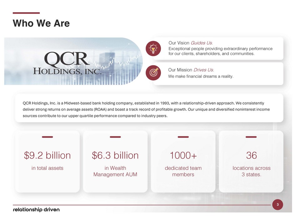 Exceptional people providing extraordinary performance for our clients, shareholders, and communities. Our Mission Drives Us. We make financial dreams a reality. QCR Holdings, Inc. is a Midwest - based bank holding company, established in 1993, with a relationship - driven approach. We consistently deliver strong returns on average assets (ROAA) and boast a track record of profitable growth. Our unique and diversified noninterest income sources contribute to our upper quartile performance compared to industry peers. $9.2 billion in total assets $6.3 billion in Wealth Management AUM 1000+ dedicated team members 36 locations across 3 states.