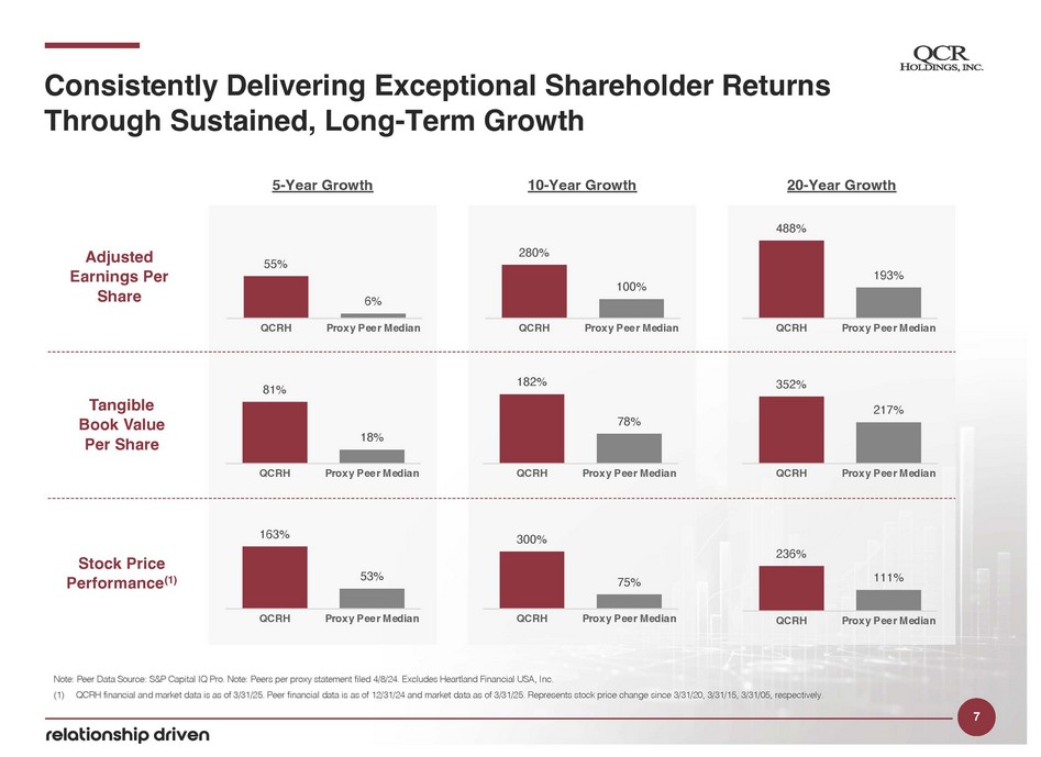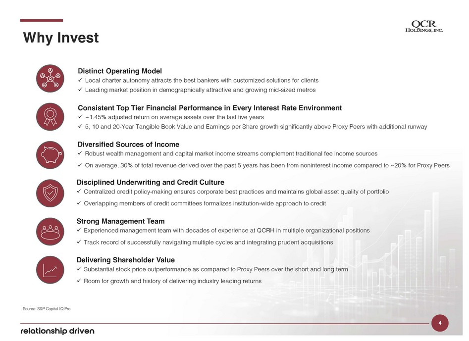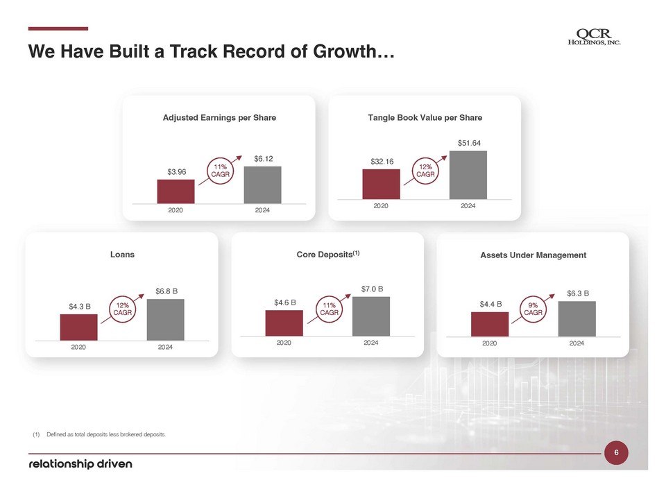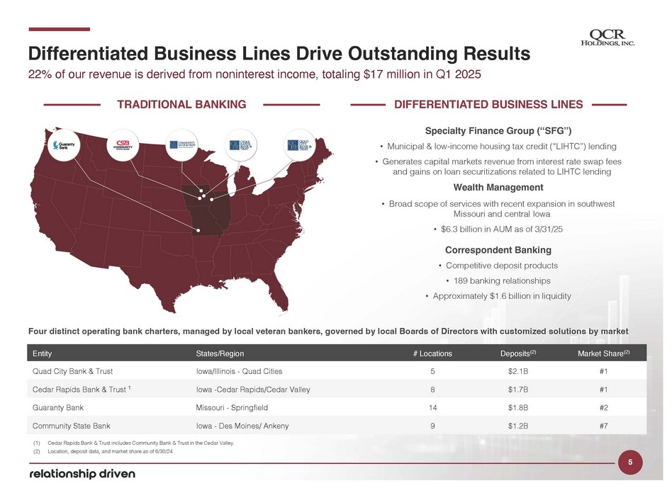 Who We Are 3 Why Invest Distinct Operating Model x Local charter autonomy attracts the best bankers with customized solutions for clients x Leading market position in demographically attractive and growing mid - sized metros Consistent Top Tier Financial Performance in Every Interest Rate Environment x ~1.45% adjusted return on average assets over the last five years x 5, 10 and 20 - Year Tangible Book Value and Earnings per Share growth significantly above Proxy Peers with additional runway Diversified Sources of Income x Robust wealth management and capital market income streams complement traditional fee income sources x On average, 30% of total revenue derived over the past 5 years has been from noninterest income compared to ~20% for Proxy Peers Disciplined Underwriting and Credit Culture x Centralized credit policy - making ensures corporate best practices and maintains global asset quality of portfolio x Overlapping members of credit committees formalizes institution - wide approach to credit Strong Management Team x Experienced management team with decades of experience at QCRH in multiple organizational positions x Track record of successfully navigating multiple cycles and integrating prudent acquisitions Delivering Shareholder Value x Substantial stock price outperformance as compared to Proxy Peers over the short and long term x Room for growth and history of delivering industry leading returns Source: S&P Capital IQ Pro 4 Differentiated Business Lines Drive Outstanding Results 22% of our revenue is derived from noninterest income, totaling $17 million in Q1 2025 9 $1.2B #7 Four distinct operating bank charters, managed by local veteran bankers, governed by local Boards of Directors with customized solutions by market Entity States/Region # Locations Deposits (2) Market Share (2) Quad City Bank & Trust Iowa/Illinois - Quad Cities 5 $2.1B #1 Cedar Rapids Bank & Trust 1 Iowa - Cedar Rapids/Cedar Valley 8 $1.7B #1 Guaranty Bank Missouri - Springfield 14 $1.8B #2 TRADITIONAL BANKING DIFFERENTIATED BUSINESS LINES Specialty Finance Group (“SFG”) • Municipal & low - income housing tax credit (“LIHTC”) lending • Generates capital markets revenue from interest rate swap fees and gains on loan securitizations related to LIHTC lending Wealth Management • Broad scope of services with recent expansion in southwest Missouri and central Iowa • $6.3 billion in AUM as of 3/31/25 Correspondent Banking • Competitive deposit products • 189 banking relationships • Approximately $1.6 billion in liquidity 5 Community State Bank Iowa - Des Moines/ Ankeny (1) Cedar Rapids Bank & Trust includes Community Bank & Trust in the Cedar Valley.