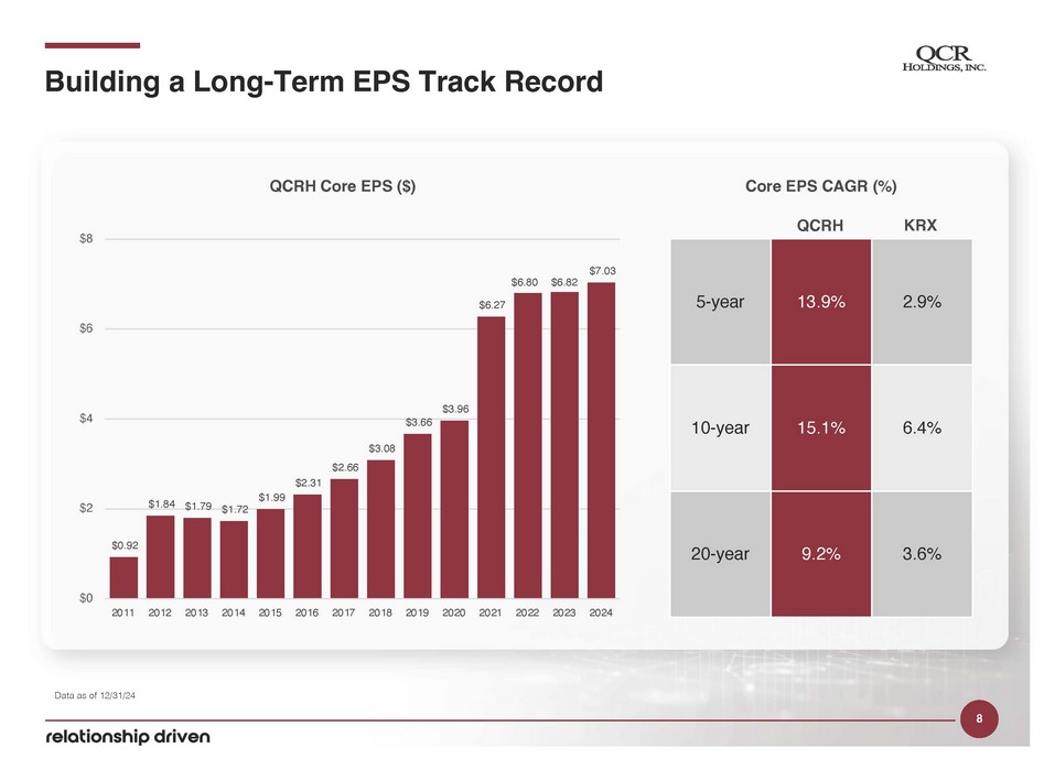 Note: Peers per proxy statement filed 4/8/24. Excludes Heartland Financial USA, Inc. (1) QCRH financial and market data is as of 3/31/25. Peer financial data is as of 12/31/24 and market data as of 3/31/25. Represents stock price change since 3/31/20, 3/31/15, 3/31/05, respectively. Adjusted Earnings Per Share Tangible Book Value Per Share Stock Price Performance (1) 20 - Year Growth 55% 6% QCRH Proxy Peer Median 280% 100% QCRH Proxy Peer Median 488% 193% QCRH Proxy Peer Median 352% 217% QCRH Proxy Peer Median 10 - Year Growth 5 - Year Growth 182% 78% QCRH Proxy Peer Median 81% 18% QCRH Proxy Peer Median 163% 53% QCRH Proxy Peer Median 300% 75% QCRH Proxy Peer Median 236% 7 111% QCRH Proxy Peer Median QCRH Core EPS ($) Core EPS CAGR (%) 2.9% 13.9% 5 - year 6.4% 15.1% 10 - year 3.6% 9.2% 20 - year $0.92 8 $1.84 $1.79 $1.72 $1.99 $3.08 $2.66 $2.31 $3.66 $3.96 $6.27 $6.80 $6.82 $7.03 $2 $4 $6 $8 $0 2011 2012 2013 2014 2015 2016 2017 2018 2019 2020 2021 2022 2023 2024 Data as of 12/31/24 Building a Long - Term EPS Track Record KRX QCRH