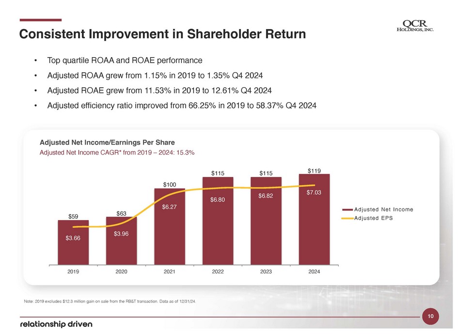QCRH TBVPS ($) TBVPS (%) $15.92 $17.08 $14.29 $17.50 $18.81 $20.11 $22.70 $24.04 $28.15 $32.16 $38.02 $36.82 $43.81 $50.21 9 $40.68 $47.15 $53.75 $0 $30 $60 2011 2012 2013 2014 2015 2016 2017 2018 2019 2020 2021 2022 (1) 2023 (1) 2024 (1) 3.7% 12.3% 5 - year 5.2% 11.1% 10 - year 4.7% 7.8% 20 - year KRX Top Tier Tangible Book Value Per Share Growth QCRH Date as of 12/31/24 (1) TBVPS TBVPS of $40.68, $47.15 and $53.75 for 2022, 2023 and 2024, respectively, excludes the impact of AOCI.