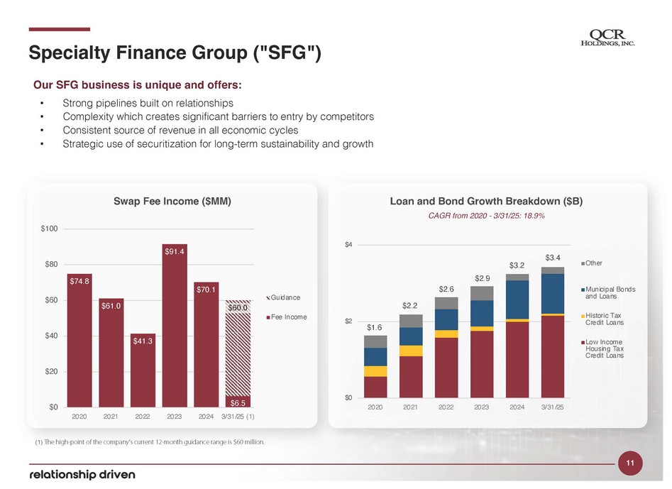 • Diverse wealth management solutions serving a wide range of clients • Over 1,600 new relationships added over the last five years • Expanded Wealth Management business to Guaranty Bank charter in Q2 2023 and Community State Bank charter in Q2 2024 $4.4 $5.4 $6.3 Assets Under Management ($B) CAGR from 2020 – 3/31/25: 9.2% Number of New Client Relationships Added 206 321 340 340 469 Wealth Management Services $6.3 500 (1) (1) Annualized $2.3 $3.2 $3.8 $4.9 $5.7 $6.1 $6.7 $8.5 $9.0 $9.2 $0.6 $0.3 $0.6 $1.2 $0 $2 $4 $6 $8 $10 2016 2017 2018 2019 2020 2021 2022 2023 2024 3/31/25 Acquired Assets Total Assets (1) Rockford Bank & Trust assets were removed from this data.