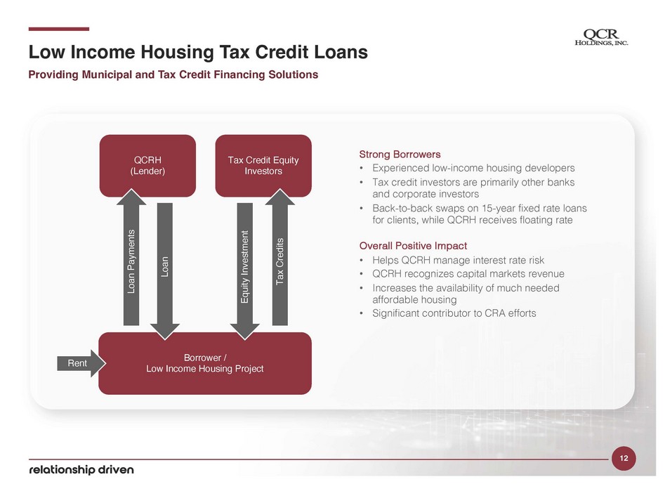 Our SFG business is unique and offers: • Strong pipelines built on relationships • Complexity which creates significant barriers to entry by competitors • Consistent source of revenue in all economic cycles • Strategic use of securitization for long - term sustainability and growth $0 $2 $4 2020 2021 2022 2023 2024 3/ 31/25 Other Municipal Bonds and Loans Historic Tax Credit Loans Low Income Housing Tax Credit Loans $1.6 $2.2 $2.6 $3.2 $3.4 $2.9 Specialty Finance Group ("SFG") Swap Fee Income ($MM) Loan and Bond Growth Breakdown ($B) CAGR from 2020 - 3/31/25: 18.9% $74.8 $61.0 $41.3 $91.4 $70.1 $6.5 $60.0 $0 $20 $40 $60 $80 $100 2020 2021 2022 2023 2024 3/ 31/25 (1) Guidance Fee Income 11 (1) The high - point of the company's current 12 - month guidance range is $60 million.
