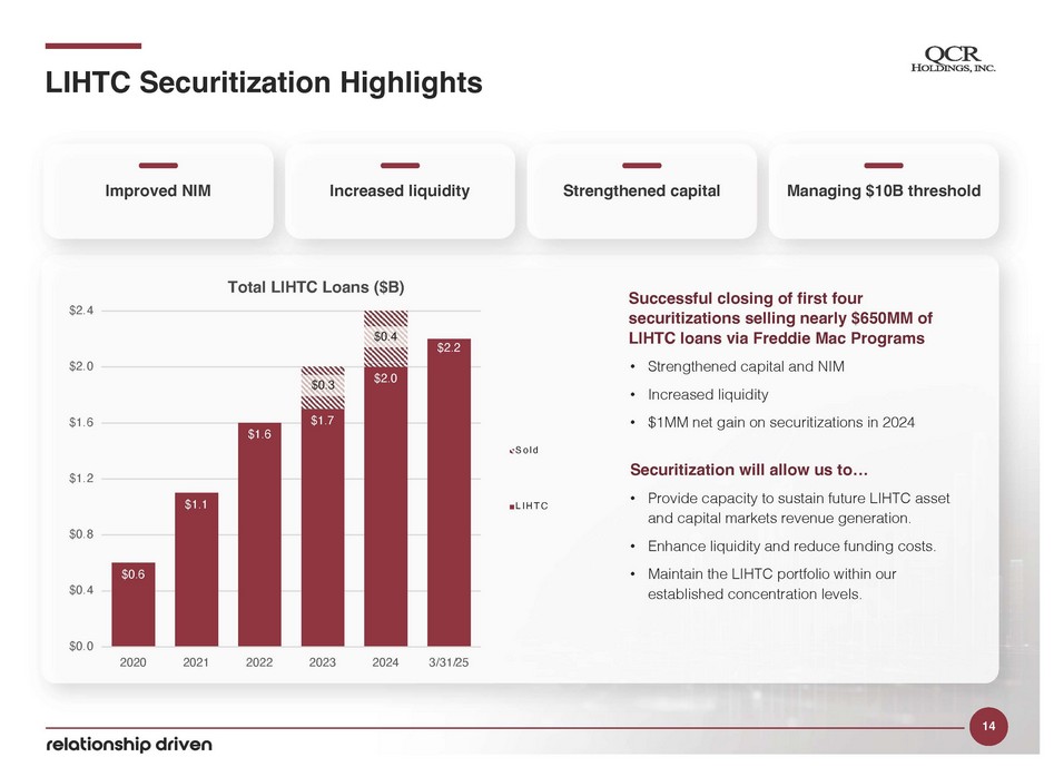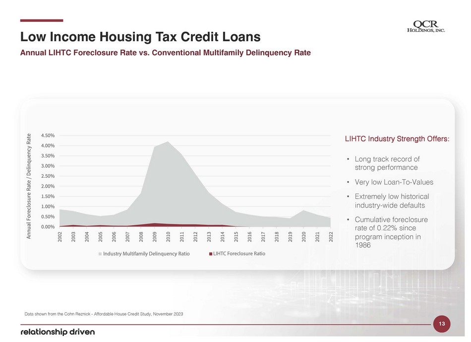 QCRH (Lender) Borrower / Low Income Housing Project Tax Credit Equity Investors Loan Payments Tax Credits Equity Investment Loan Rent 12 Strong Borrowers • Experienced low - income housing developers • Tax credit investors are primarily other banks and corporate investors • Back - to - back swaps on 15 - year fixed rate loans for clients, while QCRH receives floating rate Overall Positive Impact • Helps QCRH manage interest rate risk • QCRH recognizes capital markets revenue • Increases the availability of much needed affordable housing • Significant contributor to CRA efforts Low Income Housing Tax Credit Loans Providing Municipal and Tax Credit Financing Solutions Low Income Housing Tax Credit Loans Annual LIHTC Foreclosure Rate vs. Conventional Multifamily Delinquency Rate Data shown from the Cohn Reznick - Affordable House Credit Study, November 2023 LIHTC Industry Strength Offers: • Long track record of strong performance • Very low Loan - To - Values • Extremely low historical industry - wide defaults • Cumulative foreclosure rate of 0.22% since program inception in 1986 13