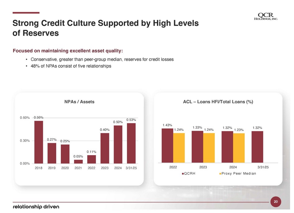 $907 LIHTC 13% $1,016 LIHTC Construction 15% $209 CRE - Office 3% $893 CRE - Non - Office 13% $403 Construction & Land Dev 6% $290 Multi - Family 4% 19 • CRE is 55% of total loans • CRE - Office represents only 3% of Total Loans • 12 CRE - Office loans > $3 million (total of $61 million) • CRE - Office is primarily smaller facilities (three stories or less) and located within the QCRH footprint • Negligible non - performing CRE - Office loans of $2.9 million or 4 basis point of total loans and leases • Over 99% of all CRE loans are performing CRE and CRE Office Key Takeaways: Our High - Performing CRE Portfolio Balances as of 3/31/25. (1) Total CRE is calculated in alignment with regulatory definitions which exclude owner - occupied CRE. Percentages in the chart are as a percent of total loans.
