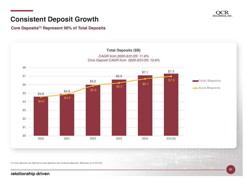 TOTAL CRE (1) $3.7 Billion NPAs / Assets 0.27% 0.25% 0.11% 0.05% 0.40% 0.50% 0.53% 0.00% 0.30% 0.60% 0.56% 2018 2019 2020 2021 2022 2023 2024 3/31/25 1.43% 1.32% 1.24% 1.33% 1.24% 1.32% 1.23% 2022 2023 3/31/25 QCRH 2024 Proxy Peer Median ACL – Loans HFI/Total Loans (%) 20 Strong Credit Culture Supported by High Levels of Reserves Focused on maintaining excellent asset quality: • Conservative, greater than peer - group median, reserves for credit losses • 48% of NPAs consist of five relationships Core Deposits (1) Represent 96% of Total Deposits (1) Core deposits are defined as total deposits less brokered deposits.
