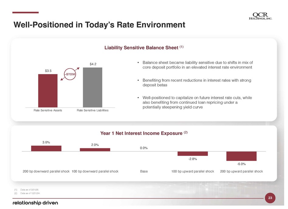 Total Deposit Composition TOTAL $7.3 Billion TOTAL $7.3 Billion Treasury Management Solutions • Local dedicated teams of treasury management specialists • Market leading client - facing technology • Comprehensive fraud prevention applications • Innovative payment and disbursement services • Cash flow and receivables management Deposit Composition Deposit Base $4.2 Rate Sensitive Assets Rate Sensitive Liabilities Well - Positioned in Today’s Rate Environment • Balance sheet became liability sensitive due to shifts in mix of core deposit portfolio in an elevated interest rate environment • Benefiting from recent reductions in interest rates with strong deposit betas • Well - positioned to capitalize on future interest rate cuts, while also benefiting from continued loan repricing under a potentially steepening yield curve Liability Sensitive Balance Sheet (1) $3.5 ~$700M 3.6% 23 2.0% 0.0% - 2.8% - 6.0% 200 bp downward parallel shock 100 bp downward parallel shock Base 100 bp upward parallel shock 200 bp upward parallel shock Year 1 Net Interest Income Exposure (2) (1) Data as of 3/31/25. (2) Data as of 12/31/24.