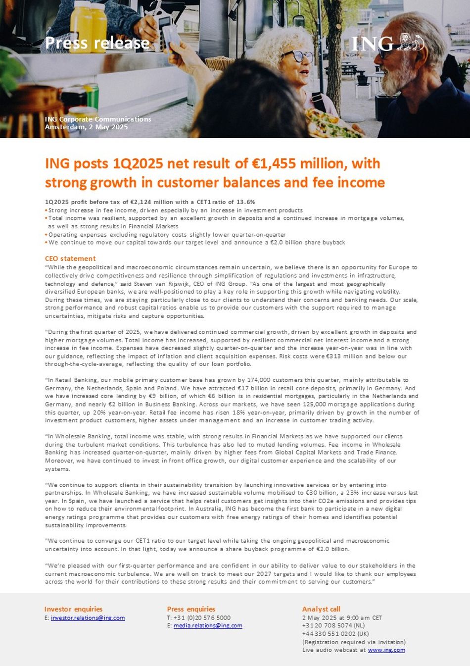 ING posts 1Q2025 net result of €1,455 million, with strong growth in customer balances and fee income 1Q2025 profit before tax of €2,124 million with a CET1 ratio of 13.6% • Strong increase in fee income, driven especially by an increase in investment products • Total income was resilient, supported by an excellent growth in deposits and a continued increase in mortgage volumes, as well as strong results in Financial Markets • Operating expenses excluding regulatory costs slightly lower quarter - on - quarter • We continue to move our capital towards our target level and announce a €2.0 billion share buyback CEO statement “While the geopolitical and macroeconomic circumstances remain uncertain, we believe there is an opportunity for Europe to collectively drive competitiveness and resilience through simplification of regulations and investments in infrastructure, technology and defence,” said Steven van Rijswijk, CEO of ING Group. "As one of the largest and most geographically diversified European banks, we are well - positioned to play a key role in supporting this growth while navigating volatility. During these times, we are staying particularly close to our clients to understand their concerns and banking needs. Our scale, strong performance and robust capital ratios enable us to provide our customers with the support required to manage uncertainties, mitigate risks and capture opportunities. "During the first quarter of 2025, we have delivered continued commercial growth, driven by excellent growth in deposits and higher mortgage volumes. Total income has increased, supported by resilient commercial net interest income and a strong increase in fee income. Expenses have decreased slightly quarter - on - quarter and the increase year - on - year was in line with our guidance, reflecting the impact of inflation and client acquisition expenses. Risk costs were €313 million and below our through - the - cycle - average, reflecting the quality of our loan portfolio. “In Retail Banking, our mobile primary customer base has grown by 174,000 customers this quarter, mainly attributable to Germany, the Netherlands, Spain and Poland. We have attracted €17 billion in retail core deposits, primarily in Germany. And we have increased core lending by €9 billion, of which €6 billion is in residential mortgages, particularly in the Netherlands and Germany, and nearly €2 billion in Business Banking. Across our markets, we have seen 125,000 mortgage applications during this quarter, up 20% year - on - year. Retail fee income has risen 18% year - on - year, primarily driven by growth in the number of investment product customers, higher assets under management and an increase in customer trading activity. “In Wholesale Banking, total income was stable, with strong results in Financial Markets as we have supported our clients during the turbulent market conditions. This turbulence has also led to muted lending volumes. Fee income in Wholesale Banking has increased quarter - on - quarter, mainly driven by higher fees from Global Capital Markets and Trade Finance. Moreover, we have continued to invest in front office growth, our digital customer experience and the scalability of our systems. “We continue to support clients in their sustainability transition by launching innovative services or by entering into partnerships. In Wholesale Banking, we have increased sustainable volume mobilised to €30 billion, a 23% increase versus last year. In Spain, we have launched a service that helps retail customers get insights into their CO2e emissions and provides tips on how to reduce their environmental footprint. In Australia, ING has become the first bank to participate in a new digital energy ratings programme that provides our customers with free energy ratings of their homes and identifies potential sustainability improvements. "We continue to converge our CET1 ratio to our target level while taking the ongoing geopolitical and macroeconomic uncertainty into account. In that light, today we announce a share buyback programme of €2.0 billion. “We’re pleased with our first - quarter performance and are confident in our ability to deliver value to our stakeholders in the current macroeconomic turbulence . We are well on track to meet our 2027 targets and I would like to thank our employees across the world for their contributions to these strong results and their commitment to serving our customers .