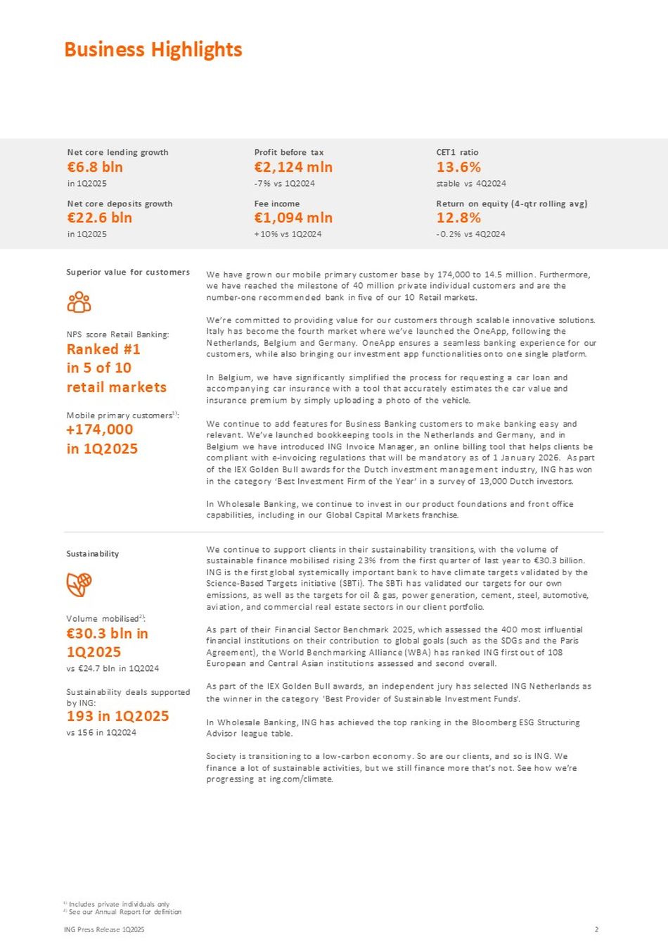 ” Press release ING Corporate Communications Amsterdam, 2 May 2025 Investor enquiries E: investor.relations@ing.com Press enquiries T: +31 (0)20 576 5000 E: media.relations@ing.com Analyst call 2 May 2025 at 9:00 am CET +31 20 708 5074 (NL) +44 330 551 0202 (UK) (Registration required via invitation) Live audio webcast at www.ing.com Net core lending growth €6.8 bln in 1Q2025 Net core deposits growth €22.6 bln in 1Q2025 Profit before tax €2,124 mln - 7% vs 1Q2024 Fee income €1,094 mln +10% vs 1Q2024 CET1 ratio 13.6% stable vs 4Q2024 Return on equity (4 - qtr rolling avg) 12.8% - 0.2% vs 4Q2024 Superior value for customers NPS score Retail Banking: Ranked #1 in 5 of 10 retail markets Mobile primary customers 1) : +174,000 in 1Q2025 Sustainability Volume mobilised 2) : €30.3 bln in 1Q2025 vs €24.7 bln in 1Q2024 ING Press Release 1Q2025 2 Sustainability deals supported by ING: 193 in 1Q2025 vs 156 in 1Q2024 Business Highlights We continue to support clients in their sustainability transitions, with the volume of sustainable finance mobilised rising 23% from the first quarter of last year to €30.3 billion. ING is the first global systemically important bank to have climate targets validated by the Science - Based Targets initiative (SBTi). The SBTi has validated our targets for our own emissions, as well as the targets for oil & gas, power generation, cement, steel, automotive, aviation, and commercial real estate sectors in our client portfolio. As part of their Financial Sector Benchmark 2025, which assessed the 400 most influential financial institutions on their contribution to global goals (such as the SDGs and the Paris Agreement), the World Benchmarking Alliance (WBA) has ranked ING first out of 108 European and Central Asian institutions assessed and second overall. As part of the IEX Golden Bull awards, an independent jury has selected ING Netherlands as the winner in the category 'Best Provider of Sustainable Investment Funds'. In Wholesale Banking, ING has achieved the top ranking in the Bloomberg ESG Structuring Advisor league table. Society is transitioning to a low - carbon economy. So are our clients, and so is ING. We finance a lot of sustainable activities, but we still finance more that’s not. See how we’re progressing at ing.com/climate. We have grown our mobile primary customer base by 174,000 to 14.5 million. Furthermore, we have reached the milestone of 40 million private individual customers and are the number - one recommended bank in five of our 10 Retail markets. We’re committed to providing value for our customers through scalable innovative solutions. Italy has become the fourth market where we’ve launched the OneApp, following the Netherlands, Belgium and Germany. OneApp ensures a seamless banking experience for our customers, while also bringing our investment app functionalities onto one single platform. In Belgium, we have significantly simplified the process for requesting a car loan and accompanying car insurance with a tool that accurately estimates the car value and insurance premium by simply uploading a photo of the vehicle . We continue to add features for Business Banking customers to make banking easy and relevant. We’ve launched bookkeeping tools in the Netherlands and Germany, and in Belgium we have introduced ING Invoice Manager, an online billing tool that helps clients be compliant with e - invoicing regulations that will be mandatory as of 1 January 2026. As part of the IEX Golden Bull awards for the Dutch investment management industry, ING has won in the category ‘Best Investment Firm of the Year’ in a survey of 13,000 Dutch investors. In Wholesale Banking, we continue to invest in our product foundations and front office capabilities, including in our Global Capital Markets franchise.