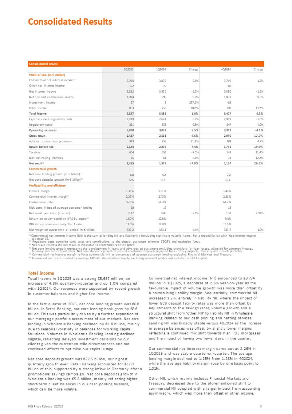 1) Includes private individuals only 2) See our Annual Report for definition ING Press Release 1Q2025 3 Consolidated results Change 4Q2024 Change 1Q2024 1Q2025 1.2% 3,749 - 69 - 2.6% 3,897 - 72 3,794 - 172 Profit or loss (in € million) Commercial net interest income 1) Other net interest income - 1.6% 3,680 - 5.3% 3,825 3,622 Net interest income 9.3% 1,001 9.6% 998 1,094 Net fee and commission income - 63 237.5% 8 27 Investment income 13.2% 789 18.8% 752 893 Other income 4.3% 5,407 1.0% 5,583 5,637 Total income - 5.0% 2,989 6.2% 2,674 2,839 Expenses excl. regulatory costs 4.0% 347 0.8% 358 361 Regulatory costs 2) - 4.1% 3,337 5.5% 3,032 3,200 Operating expenses 17.7% 2,070 - 4.5% 2,551 2,437 Gross result 4.7% 299 21.3% 258 313 Addition to loan loss provisions 19.9% 1,771 - 7.4% 2,293 2,124 Result before tax 11.4% 542 - 7.5% 653 604 Taxation - 12.2% 74 6.6% 61 65 Non - controlling interests 26.1% 1,154 - 7.8% 1,578 1,455 Net result 3) 7.2 16.4 4.2 13.5 6.8 22.6 Commercial growth Net core lending growth (in € billion) 4) Net core deposits growth (in € billion) 4) Profitability and efficiency 1.40% 1.51% 1.36% Interest margin 2.26% 2.43% 2.26% Commercial interest margin 5) 61.7% 54.3% 56.8% Cost/income ratio 18 16 18 Risk costs in bps of average customer lending 27.0% 0.37 - 2.1% 0.48 0.47 Net result per share (in euros) 9.4% 12.8% 12.0% Return on equity based on IFRS - EU equity 6) 13.6% 14.8% 13.6% ING Group common equity Tier 1 ratio 1.0% 333.7 4.4% 323.1 337.2 Risk - weighted assets (end of period, in € billion) see page 15. 1) Commercial net interest income (NII) is the sum of lending NII and liability NII (excluding significant volatile items). For a reconciliation with 'Net interest income' 2) Regulatory costs comprise bank taxes and contributions to the deposit guarantee schemes (‘DGS’) and resolution funds. 3) Net result reflects the net result attributable to shareholders of the parent. 4) Net core lending growth represents the development in loans and advances to customers excluding provisions for loan losses, adjusted for currency impacts, Treasury and run - off portfolios. Net core deposits growth represents customer deposits adjusted for currency impacts, Treasury and run - off portfolios. 5) Commercial net interest margin reflects commercial NII as percentage of average customer lending excluding Financial Markets and Treasury. 6) Annualised net result divided by average IFRS - EU shareholders' equity excluding reserved profits not included in CET1 capital. Total income Total income in 1Q2025 was a strong €5,637 million, an increase of 4.3% quarter - on - quarter and up 1.0% compared with 1Q2024. Our revenues were supported by record growth in customer balances and higher fee income. In the first quarter of 2025, net core lending growth was €6.8 billion. In Retail Banking, our core lending book grew by €8.6 billion. This was particularly driven by a further expansion of our mortgage portfolio across most of our markets. Net core lending in Wholesale Banking declined by €1.8 billion, mainly due to seasonal volatility in balances for Working Capital Solutions. Volumes in Wholesale Banking Lending declined slightly, reflecting delayed investment decisions by our clients given the current volatile circumstances and our continued efforts to optimise our capital usage. Net core deposits growth was €22.6 billion, our highest quarterly growth ever. Retail Banking accounted for €17.0 billion of this, supported by a strong inflow in Germany after a promotional savings campaign. Net core deposits growth in Wholesale Banking was €5.6 billion, mainly reflecting higher short - term client balances in our cash pooling business, which can be more volatile. Commercial net interest income (NII) amounted to €3,794 million in 1Q2025, a decrease of 2.6% year - on - year as the favourable impact of volume growth was more than offset by a normalising liability margin. Sequentially, commercial NII increased 1.2%, entirely in liability NII, where the impact of lower ECB deposit facility rates was more than offset by adjustments to the savings rates, volume growth and a structural shift from 'other NII' to liability NII in Wholesale Banking related to our cash pooling and netting services. Lending NII was broadly stable versus 4Q2024 as the increase in average balances was offset by slightly lower margins, reflecting a continued mix shift towards high ROE mortgages and the impact of having two fewer days in the quarter. Our commercial net interest margin came out at 2.26% in 1Q2025 and was stable quarter - on - quarter. The average lending margin declined to 1.25% from 1.28% in 4Q2024, while the average liability margin rose by one basis point to 1.01%. Other NII, which mainly includes Financial Markets and Treasury, decreased due to the aforementioned shift to commercial NII coupled with a larger impact from accounting asymmetry, which was more than offset in other income. Consolidated Results Net interest income (in € million) and net interest margin (in %) Total net fee and commission income rose 9.6% year - on - year and 9.3% sequentially to €1,094 million.