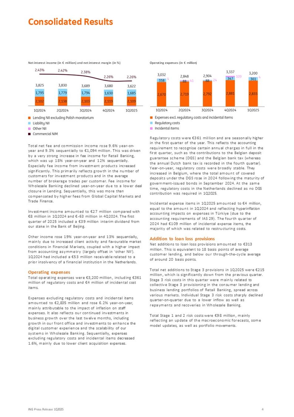 This was driven by a very strong increase in fee income for Retail Banking, which was up 18% year - on - year and 12% sequentially. Especially fee income from investment products increased significantly. This primarily reflects growth in the number of customers for investment products and in the average number of brokerage trades per customer. Fee income for Wholesale Banking declined year - on - year due to a lower deal closure in Lending. Sequentially, this was more than compensated by higher fees from Global Capital Markets and Trade Finance. Investment income amounted to €27 million compared with €8 million in 1Q2024 and € - 63 million in 4Q2024. The first quarter of 2025 included a €39 million interim dividend from our stake in the Bank of Beijing. Other income rose 19% year - on - year and 13% sequentially, mainly due to increased client activity and favourable market conditions in Financial Markets, coupled with a higher impact from accounting asymmetry (largely offset in 'other NII'). 1Q2024 had included a €53 million receivable related to a prior insolvency of a financial institution in the Netherlands. Operating expenses Total operating expenses were €3,200 million, including €361 million of regulatory costs and €4 million of incidental cost items. Expenses excluding regulatory costs and incidental items amounted to €2,835 million and rose 6.2% year - on - year, mainly attributable to the impact of inflation on staff expenses. It also reflects our continued investments in business growth over the last twelve months, including growth in our front office and investments to enhance the digital customer experience and the scalability of our systems in Wholesale Banking. Sequentially, expenses excluding regulatory costs and incidental items decreased 1.6%, mainly due to lower client acquisition expenses. Operating expenses (in € million) Regulatory costs were €361 million and are seasonally higher in the first quarter of the year. This reflects the accounting requirement to recognise certain annual charges in full in the first quarter, such as the contributions to the Belgian deposit guarantee scheme (DGS) and the Belgian bank tax (whereas the annual Dutch bank tax is recorded in the fourth quarter). Year - on - year, regulatory costs were broadly stable. They increased in Belgium, where the total amount of covered deposits under the DGS rose in 2024 following the maturity of government - issued bonds in September 2024. At the same time, regulatory costs in the Netherlands declined as no DGS contribution was required in 1Q2025. Incidental expense items in 1Q2025 amounted to €4 million, equal to the amount in 1Q2024 and reflecting hyperinflation accounting impacts on expenses in Türkiye (due to the accounting requirements of IAS 29). The fourth quarter of 2024 had €109 million of incidental expense items, the majority of which was related to restructuring costs. Addition to loan loss provisions Net additions to loan loss provisions amounted to €313 million. This is equivalent to 18 basis points of average customer lending, and below our through - the - cycle average of around 20 basis points. ING Press Release 1Q2025 4 Total net additions to Stage 3 provisions in 1Q2025 were €215 million, which is significantly down from the previous quarter. Stage 3 risk costs in this quarter were mainly related to collective Stage 3 provisioning in the consumer lending and business lending portfolios of Retail Banking, spread across various markets. Individual Stage 3 risk costs sharply declined quarter - on - quarter due to a lower inflow as well as repayments and recoveries in Wholesale Banking. Total Stage 1 and 2 risk costs were €98 million, mainly reflecting an update of the macroeconomic forecasts, some model updates, as well as portfolio movements. Consolidated Results Addition to loan loss provisions (in € million) Risk costs for Retail Banking were €175 million, or 14 basis points of average customer lending.