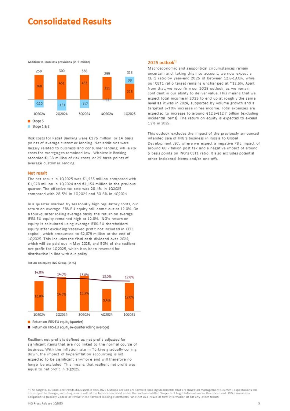 Net additions were largely related to business and consumer lending, while risk costs for mortgages remained low. Wholesale Banking recorded €138 million of risk costs, or 29 basis points of average customer lending. Net result The net result in 1Q2025 was €1,455 million compared with €1,578 million in 1Q2024 and €1,154 million in the previous quarter. The effective tax rate was 28.4% in 1Q2025 compared with 28.5% in 1Q2024 and 30.6% in 4Q2024. In a quarter marked by seasonally high regulatory costs, our return on average IFRS - EU equity still came out at 12.0%. On a four - quarter rolling average basis, the return on average IFRS - EU equity remained high at 12.8%. ING’s return on equity is calculated using average IFRS - EU shareholders' equity after excluding 'reserved profit not included in CET1 capital', which amounted to €2,879 million at the end of 1Q2025. This includes the final cash dividend over 2024, which will be paid out in May 2025, and 50% of the resilient net profit for 1Q2025, which has been reserved for distribution in line with our policy. Return on equity ING Group (in %) Resilient net profit is defined as net profit adjusted for significant items that are not linked to the normal course of business. With the inflation rate in Türkiye gradually coming down, the impact of hyperinflation accounting is not expected to be significant anymore and will therefore no longer be excluded. This means that resilient net profit was equal to net profit in 1Q2025. ING Press Release 1Q2025 5 2025 outlook 1) Macroeconomic and geopolitical circumstances remain uncertain and, taking this into account, we now expect a CET1 ratio by year - end 2025 of between 12.8 - 13.0%, while our CET1 ratio target remains unchanged at ~12.5%. Apart from that, we reconfirm our 2025 outlook, as we remain confident in our ability to deliver value. This means that we expect total income in 2025 to end up at roughly the same level as it was in 2024, supported by volume growth and a targeted 5 - 10% increase in fee income. Total expenses are expected to increase to around €12.5 - €12.7 billion (excluding incidental items). The return on equity is expected to exceed 12% in 2025. This outlook excludes the impact of the previously announced intended sale of ING’s business in Russia to Global Development JSC, where we expect a negative P&L impact of around €0.7 billion post tax and a negative impact of around 5 basis points on ING’s CET1 ratio. It also excludes potential other incidental items and/or one - offs. Consolidated Results 1) The targets, outlook and trends discussed in this 2025 Outlook section are forward - looking statements that are based on management’s current expectations and are subject to change, including as a result of the factors described under the section entitled ‘Important Legal Information’ in this document. ING assumes no obligation to publicly update or revise these forward - looking statements, whether as a result of new information or for any other reason.