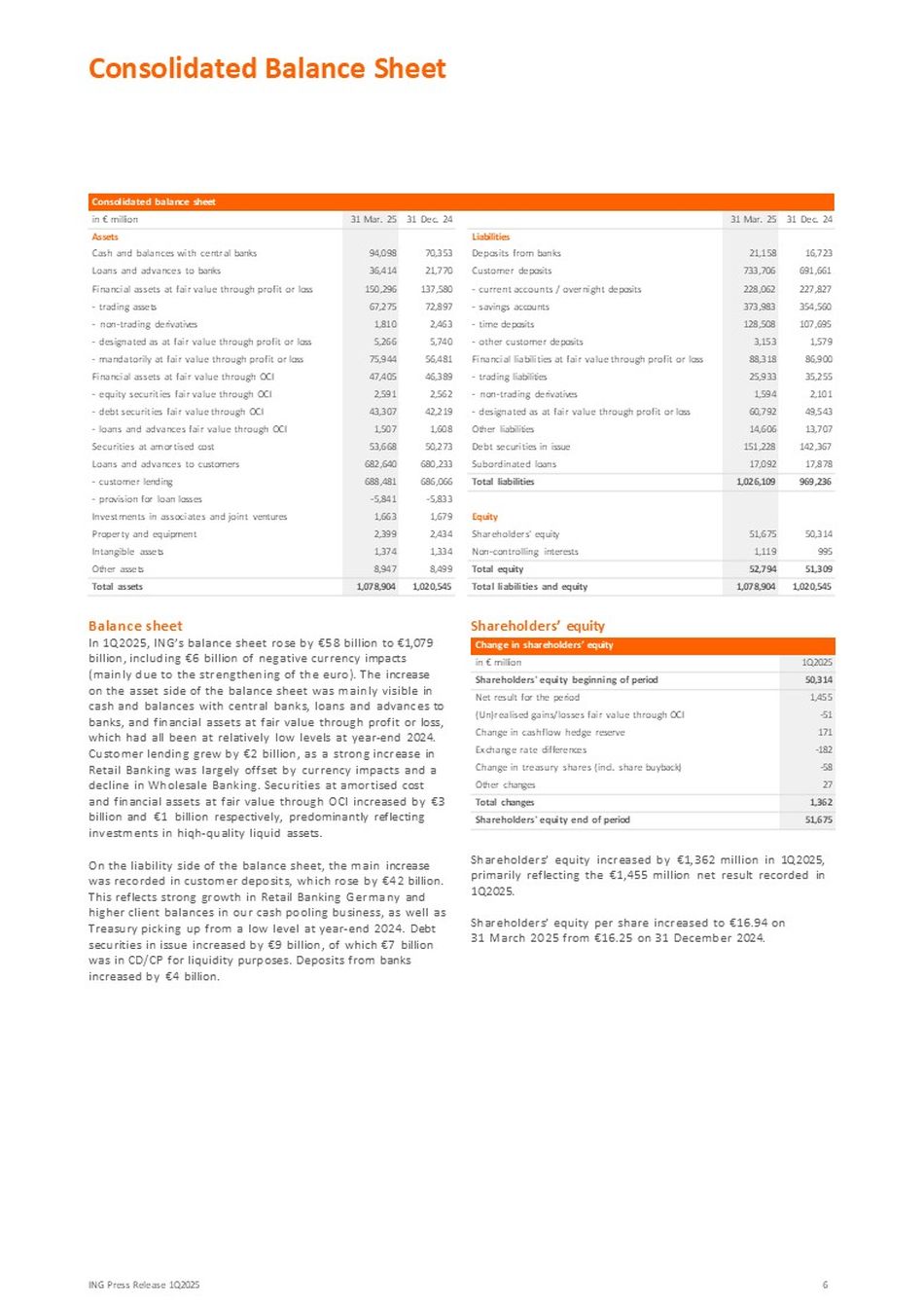 ING Press Release 1Q2025 6 Consolidated balance sheet 31 Dec. 24 31 Mar. 25 31 Dec. 24 31 Mar. 25 in € million Liabilities Assets 16,723 21,158 Deposits from banks 70,353 94,098 Cash and balances with central banks 691,661 733,706 Customer deposits 21,770 36,414 Loans and advances to banks 227,827 228,062 - current accounts / overnight deposits 137,580 150,296 Financial assets at fair value through profit or loss 354,560 373,983 - savings accounts 72,897 67,275 - trading assets 107,695 128,508 - time deposits 2,463 1,810 - non - trading derivatives 1,579 3,153 - other customer deposits 5,740 5,266 - designated as at fair value through profit or loss 86,900 88,318 Financial liabilities at fair value through profit or loss 56,481 75,944 - mandatorily at fair value through profit or loss 35,255 25,933 - trading liabilities 46,389 47,405 Financial assets at fair value through OCI 2,101 1,594 - non - trading derivatives 2,562 2,591 - equity securities fair value through OCI 49,543 60,792 - designated as at fair value through profit or loss 42,219 43,307 - debt securities fair value through OCI 13,707 14,606 Other liabilities 1,608 1,507 - loans and advances fair value through OCI 142,367 151,228 Debt securities in issue 50,273 53,668 Securities at amortised cost 17,878 17,092 Subordinated loans 680,233 682,640 Loans and advances to customers 969,236 1,026,109 Total liabilities 686,066 688,481 - customer lending - 5,833 - 5,841 - provision for loan losses Equity 1,679 1,663 Investments in associates and joint ventures 50,314 51,675 Shareholders' equity 2,434 2,399 Property and equipment 995 1,119 Non - controlling interests 1,334 1,374 Intangible assets 51,309 52,794 Total equity 8,499 8,947 Other assets 1,020,545 1,078,904 Total liabilities and equity 1,020,545 1,078,904 Total assets Balance sheet In 1Q2025, ING’s balance sheet rose by €58 billion to €1,079 billion, including €6 billion of negative currency impacts (mainly due to the strengthening of the euro). The increase on the asset side of the balance sheet was mainly visible in cash and balances with central banks, loans and advances to banks, and financial assets at fair value through profit or loss, which had all been at relatively low levels at year - end 2024. Customer lending grew by €2 billion, as a strong increase in Retail Banking was largely offset by currency impacts and a decline in Wholesale Banking. Securities at amortised cost and financial assets at fair value through OCI increased by €3 billion and €1 billion respectively, predominantly reflecting investments in hiqh - quality liquid assets. On the liability side of the balance sheet, the main increase was recorded in customer deposits, which rose by €42 billion. This reflects strong growth in Retail Banking Germany and higher client balances in our cash pooling business, as well as Treasury picking up from a low level at year - end 2024. Debt securities in issue increased by €9 billion, of which €7 billion was in CD/CP for liquidity purposes. Deposits from banks increased by €4 billion. Shareholders’ equity Change in shareholders’ equity 1Q2025 in € million 50,314 Shareholders' equity beginning of period 1,455 Net result for the period - 51 (Un)realised gains/losses fair value through OCI 171 Change in cashflow hedge reserve - 182 Exchange rate differences - 58 Change in treasury shares (incl. share buyback) 27 Other changes 1,362 Total changes 51,675 Shareholders' equity end of period Shareholders’ equity increased by € 1 , 362 million in 1 Q 2025 , primarily reflecting the € 1 , 455 million net result recorded in 1 Q 2025 . Shareholders’ equity per share increased to €16.94 on 31 March 2025 from €16.25 on 31 December 2024.