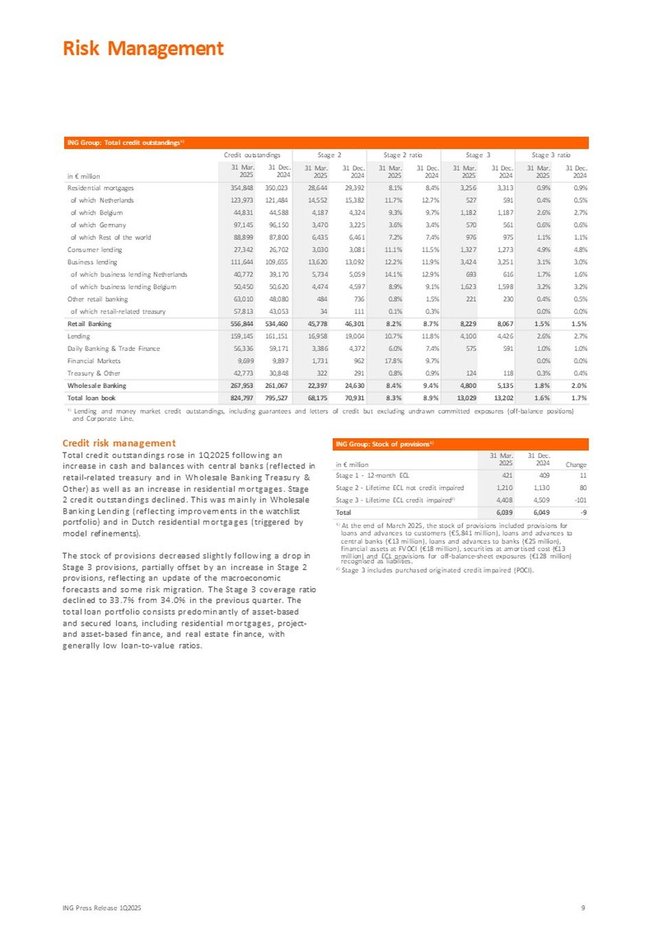 Capital, Liquidity and Funding ING Group: Total credit outstandings 1) Stage 3 ratio Stage 3 Stage 2 ratio Stage 2 Credit outstandings 31 Mar. 31 Dec. 2025 2024 in € million 31 Dec. 2024 31 Mar. 2025 31 Dec. 2024 31 Mar. 2025 31 Dec. 2024 31 Mar. 2025 31 Dec. 2024 31 Mar. 2025 0.9% 0.9% 3,313 3,256 8.4% 8.1% 29,392 28,644 350,023 354,848 Residential mortgages 0.5% 0.4% 591 527 12.7% 11.7% 15,382 14,552 121,484 123,973 of which Netherlands 2.7% 2.6% 1,187 1,182 9.7% 9.3% 4,324 4,187 44,588 44,831 of which Belgium 0.6% 0.6% 561 570 3.4% 3.6% 3,225 3,470 96,150 97,145 of which Germany 1.1% 1.1% 975 976 7.4% 7.2% 6,461 6,435 87,800 88,899 of which Rest of the world 4.8% 4.9% 1,273 1,327 11.5% 11.1% 3,081 3,030 26,702 27,342 Consumer lending 3.0% 3.1% 3,251 3,424 11.9% 12.2% 13,092 13,620 109,655 111,644 Business lending 1.6% 1.7% 616 693 12.9% 14.1% 5,059 5,734 39,170 40,772 of which business lending Netherlands 3.2% 3.2% 1,598 1,623 9.1% 8.9% 4,597 4,474 50,620 50,450 of which business lending Belgium 0.5% 0.4% 230 221 1.5% 0.8% 736 484 48,080 63,010 Other retail banking 0.0% 0.0% 0.3% 0.1% 111 34 43,053 57,813 of which retail - related treasury 1.5% 1.5% 8,067 8,229 8.7% 8.2% 46,301 45,778 534,460 556,844 Retail Banking 2.7% 2.6% 4,426 4,100 11.8% 10.7% 19,004 16,958 161,151 159,145 Lending 1.0% 1.0% 591 575 7.4% 6.0% 4,372 3,386 59,171 56,336 Daily Banking & Trade Finance 0.0% 0.0% 9.7% 17.8% 962 1,731 9,897 9,699 Financial Markets 0.4% 0.3% 118 124 0.9% 0.8% 291 322 30,848 42,773 Treasury & Other 2.0% 1.8% 5,135 4,800 9.4% 8.4% 24,630 22,397 261,067 267,953 Wholesale Banking 1.7% 1.6% 13,202 13,029 8.9% 8.3% 70,931 68,175 795,527 824,797 Total loan book ING Press Release 1Q2025 9 1) Lending and money market credit outstandings, including guarantees and letters of credit but excluding undrawn committed exposures (off - balance positions) and Corporate Line. Credit risk management Total credit outstandings rose in 1Q2025 following an increase in cash and balances with central banks (reflected in retail - related treasury and in Wholesale Banking Treasury & Other) as well as an increase in residential mortgages. Stage 2 credit outstandings declined. This was mainly in Wholesale Banking Lending (reflecting improvements in the watchlist portfolio) and in Dutch residential mortgages (triggered by model refinements). The stock of provisions decreased slightly following a drop in Stage 3 provisions, partially offset by an increase in Stage 2 provisions, reflecting an update of the macroeconomic forecasts and some risk migration. The Stage 3 coverage ratio declined to 33.7% from 34.0% in the previous quarter. The total loan portfolio consists predominantly of asset - based and secured loans, including residential mortgages, project - and asset - based finance, and real estate finance, with generally low loan - to - value ratios. ING Group: Stock of provisions 1) Change 31 Dec. 2024 31 Mar. 2025 in € million 11 409 421 Stage 1 - 12 - month ECL 80 1,130 1,210 Stage 2 - Lifetime ECL not credit impaired - 101 4,509 4,408 Stage 3 - Lifetime ECL credit impaired 2) - 9 6,049 6,039 Total recognised as liabilities. 1) At the end of March 2025, the stock of provisions included provisions for loans and advances to customers (€5,841 million), loans and advances to central banks (€13 million), loans and advances to banks (€25 million), financial assets at FVOCI (€18 million), securities at amortised cost (€13 million) and ECL provisions for off - balance - sheet exposures (€128 million) 2) Stage 3 includes purchased originated credit impaired (POCI).