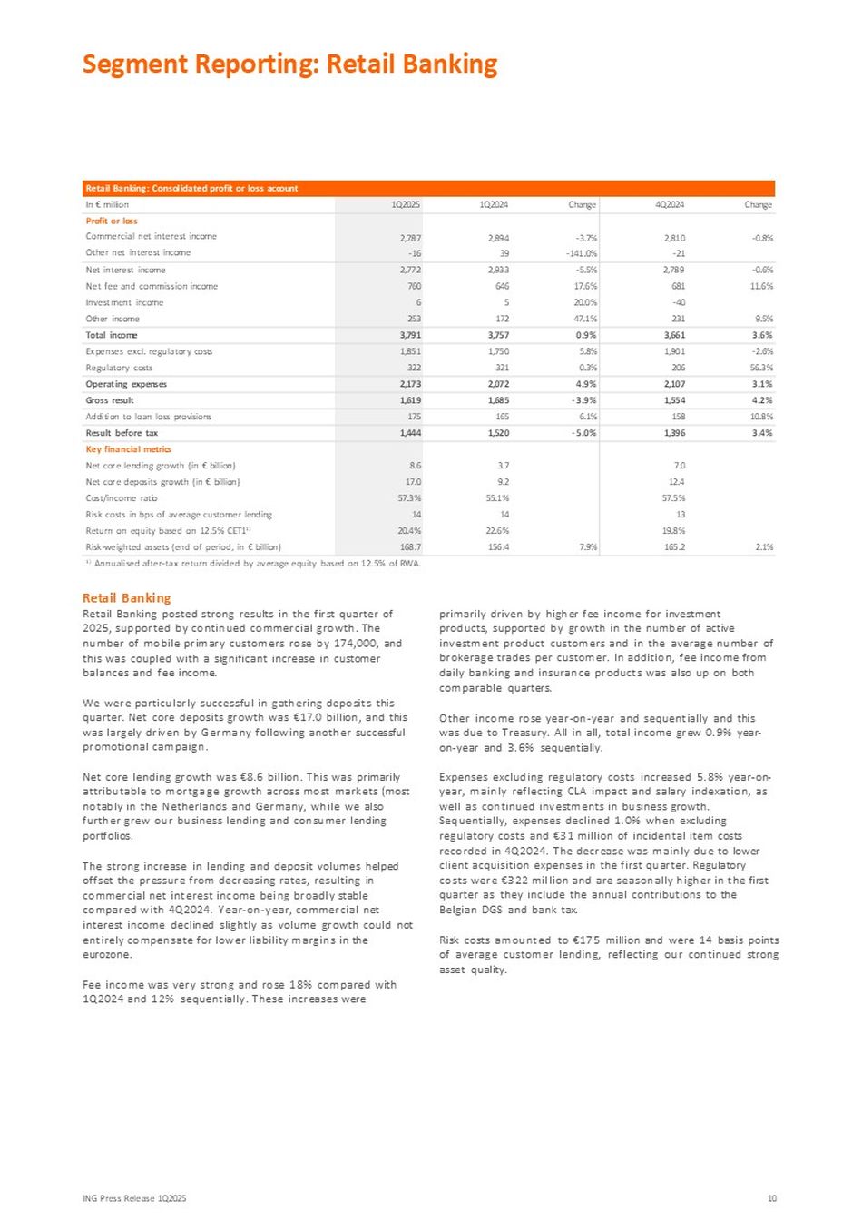 Risk Management ING Press Release 1Q2025 10 Retail Banking: Consolidated profit or loss account Change 4Q2024 Change 1Q2024 1Q2025 In € million - 0.8% 2,810 - 21 - 3.7% - 141.0% 2,894 39 2,787 - 16 Profit or loss Commercial net interest income Other net interest income - 0.6% 2,789 - 5.5% 2,933 2,772 Net interest income 11.6% 681 17.6% 646 760 Net fee and commission income - 40 20.0% 5 6 Investment income 9.5% 231 47.1% 172 253 Other income 3.6% 3,661 0.9% 3,757 3,791 Total income - 2.6% 1,901 5.8% 1,750 1,851 Expenses excl. regulatory costs 56.3% 206 0.3% 321 322 Regulatory costs 3.1% 2,107 4.9% 2,072 2,173 Operating expenses 4.2% 1,554 - 3.9% 1,685 1,619 Gross result 10.8% 158 6.1% 165 175 Addition to loan loss provisions 3.4% 1,396 - 5.0% 1,520 1,444 Result before tax Key financial metrics 7.0 3.7 8.6 Net core lending growth (in € billion) 12.4 9.2 17.0 Net core deposits growth (in € billion) 57.5% 55.1% 57.3% Cost/income ratio 13 14 14 Risk costs in bps of average customer lending 19.8% 22.6% 20.4% Return on equity based on 12.5% CET1 1) 2.1% 165.2 7.9% 156.4 168.7 Risk - weighted assets (end of period, in € billion) 1) Annualised after - tax return divided by average equity based on 12.5% of RWA. Retail Banking Retail Banking posted strong results in the first quarter of 2025, supported by continued commercial growth. The number of mobile primary customers rose by 174,000, and this was coupled with a significant increase in customer balances and fee income. We were particularly successful in gathering deposits this quarter. Net core deposits growth was €17.0 billion, and this was largely driven by Germany following another successful promotional campaign. Net core lending growth was €8.6 billion. This was primarily attributable to mortgage growth across most markets (most notably in the Netherlands and Germany, while we also further grew our business lending and consumer lending portfolios. The strong increase in lending and deposit volumes helped offset the pressure from decreasing rates, resulting in commercial net interest income being broadly stable compared with 4Q2024. Year - on - year, commercial net interest income declined slightly as volume growth could not entirely compensate for lower liability margins in the eurozone. Fee income was very strong and rose 18% compared with 1Q2024 and 12% sequentially. These increases were primarily driven by higher fee income for investment products, supported by growth in the number of active investment product customers and in the average number of brokerage trades per customer. In addition, fee income from daily banking and insurance products was also up on both comparable quarters. Other income rose year - on - year and sequentially and this was due to Treasury. All in all, total income grew 0.9% year - on - year and 3.6% sequentially. Expenses excluding regulatory costs increased 5.8% year - on - year, mainly reflecting CLA impact and salary indexation, as well as continued investments in business growth. Sequentially, expenses declined 1.0% when excluding regulatory costs and €31 million of incidental item costs recorded in 4Q2024. The decrease was mainly due to lower client acquisition expenses in the first quarter. Regulatory costs were €322 million and are seasonally higher in the first quarter as they include the annual contributions to the Belgian DGS and bank tax. Risk costs amounted to € 175 million and were 14 basis points of average customer lending, reflecting our continued strong asset quality .