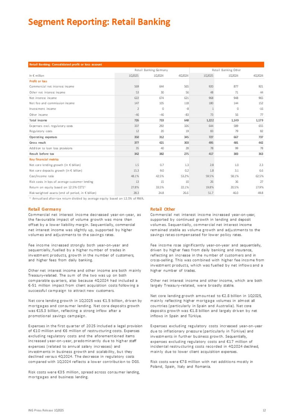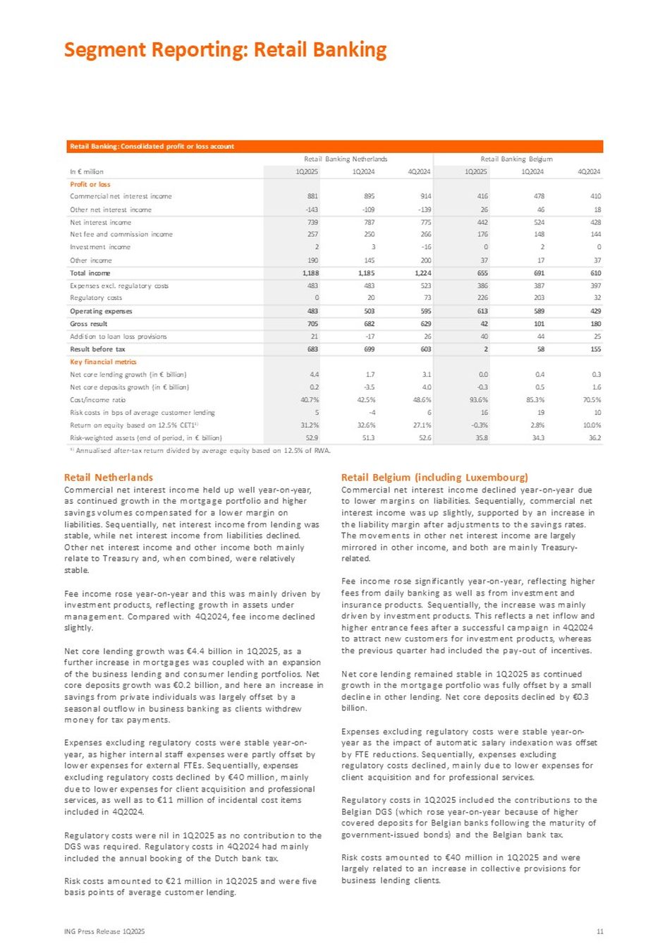 Segment Reporting: Retail Banking ING Press Release 1Q2025 11 Retail Banking: Consolidated profit or loss account Retail Banking Belgium Retail Banking Netherlands 4Q2024 1Q2024 1Q2025 4Q2024 1Q2024 1Q2025 In € million Profit or loss 410 478 416 914 895 881 Commercial net interest income 18 46 26 - 139 - 109 - 143 Other net interest income 428 524 442 775 787 739 Net interest income 144 148 176 266 250 257 Net fee and commission income 0 2 0 - 16 3 2 Investment income 37 17 37 200 145 190 Other income 610 691 655 1,224 1,185 1,188 Total income 397 387 386 523 483 483 Expenses excl. regulatory costs 32 203 226 73 20 0 Regulatory costs 429 589 613 595 503 483 Operating expenses 180 101 42 629 682 705 Gross result 25 44 40 26 - 17 21 Addition to loan loss provisions 155 58 2 603 699 683 Result before tax Key financial metrics 0.3 0.4 0.0 3.1 1.7 4.4 Net core lending growth (in € billion) 1.6 0.5 - 0.3 4.0 - 3.5 0.2 Net core deposits growth (in € billion) 70.5% 85.3% 93.6% 48.6% 42.5% 40.7% Cost/income ratio 10 19 16 6 - 4 5 Risk costs in bps of average customer lending 10.0% 2.8% - 0.3% 27.1% 32.6% 31.2% Return on equity based on 12.5% CET1 1) 36.2 34.3 35.8 52.6 51.3 52.9 Risk - weighted assets (end of period, in € billion) 1) Annualised after - tax return divided by average equity based on 12.5% of RWA. Retail Netherlands Commercial net interest income held up well year - on - year, as continued growth in the mortgage portfolio and higher savings volumes compensated for a lower margin on liabilities. Sequentially, net interest income from lending was stable, while net interest income from liabilities declined. Other net interest income and other income both mainly relate to Treasury and, when combined, were relatively stable. Fee income rose year - on - year and this was mainly driven by investment products, reflecting growth in assets under management. Compared with 4Q2024, fee income declined slightly. Net core lending growth was €4.4 billion in 1Q2025, as a further increase in mortgages was coupled with an expansion of the business lending and consumer lending portfolios. Net core deposits growth was €0.2 billion, and here an increase in savings from private individuals was largely offset by a seasonal outflow in business banking as clients withdrew money for tax payments. Expenses excluding regulatory costs were stable year - on - year, as higher internal staff expenses were partly offset by lower expenses for external FTEs. Sequentially, expenses excluding regulatory costs declined by €40 million, mainly due to lower expenses for client acquisition and professional services, as well as to €11 million of incidental cost items included in 4Q2024. Regulatory costs were nil in 1Q2025 as no contribution to the DGS was required. Regulatory costs in 4Q2024 had mainly included the annual booking of the Dutch bank tax. Risk costs amounted to €21 million in 1Q2025 and were five basis points of average customer lending. Retail Belgium (including Luxembourg) Commercial net interest income declined year - on - year due to lower margins on liabilities. Sequentially, commercial net interest income was up slightly, supported by an increase in the liability margin after adjustments to the savings rates. The movements in other net interest income are largely mirrored in other income, and both are mainly Treasury - related. Fee income rose significantly year - on - year, reflecting higher fees from daily banking as well as from investment and insurance products. Sequentially, the increase was mainly driven by investment products. This reflects a net inflow and higher entrance fees after a successful campaign in 4Q2024 to attract new customers for investment products, whereas the previous quarter had included the pay - out of incentives. Net core lending remained stable in 1Q2025 as continued growth in the mortgage portfolio was fully offset by a small decline in other lending. Net core deposits declined by €0.3 billion. Expenses excluding regulatory costs were stable year - on - year as the impact of automatic salary indexation was offset by FTE reductions. Sequentially, expenses excluding regulatory costs declined, mainly due to lower expenses for client acquisition and for professional services. Regulatory costs in 1Q2025 included the contributions to the Belgian DGS (which rose year - on - year because of higher covered deposits for Belgian banks following the maturity of government - issued bonds) and the Belgian bank tax. Risk costs amounted to € 40 million in 1 Q 2025 and were largely related to an increase in collective provisions for business lending clients .