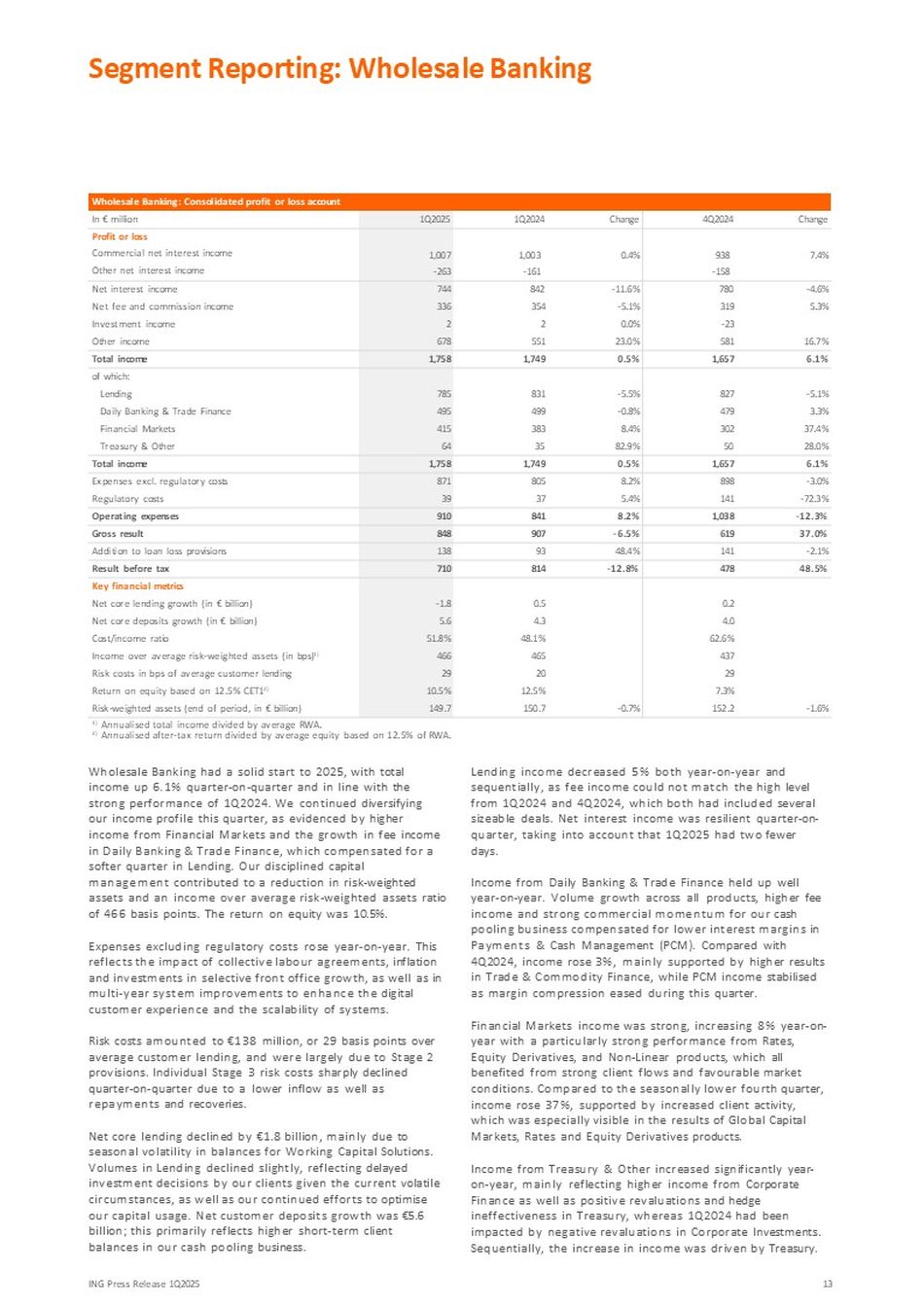 Segment Reporting: Retail Banking ING Press Release 1Q2025 13 Wholesale Banking: Consolidated profit or loss account Change 4Q2024 Change 1Q2024 1Q2025 In € million 7.4% 938 - 158 0.4% 1,003 - 161 1,007 - 263 Profit or loss Commercial net interest income Other net interest income - 4.6% 780 - 11.6% 842 744 Net interest income 5.3% 319 - 5.1% 354 336 Net fee and commission income - 23 0.0% 2 2 Investment income 16.7% 581 23.0% 551 678 Other income 6.1% 1,657 0.5% 1,749 1,758 Total income of which: - 5.1% 827 - 5.5% 831 785 Lending 3.3% 479 - 0.8% 499 495 Daily Banking & Trade Finance 37.4% 302 8.4% 383 415 Financial Markets 28.0% 50 82.9% 35 64 Treasury & Other 6.1% 1,657 0.5% 1,749 1,758 Total income - 3.0% 898 8.2% 805 871 Expenses excl. regulatory costs - 72.3% 141 5.4% 37 39 Regulatory costs - 12.3% 1,038 8.2% 841 910 Operating expenses 37.0% 619 - 6.5% 907 848 Gross result - 2.1% 141 48.4% 93 138 Addition to loan loss provisions 48.5% 478 - 12.8% 814 710 Result before tax Key financial metrics 0.2 0.5 - 1.8 Net core lending growth (in € billion) 4.0 4.3 5.6 Net core deposits growth (in € billion) 62.6% 48.1% 51.8% Cost/income ratio 437 465 466 Income over average risk - weighted assets (in bps) 1) 29 20 29 Risk costs in bps of average customer lending 7.3% 12.5% 10.5% Return on equity based on 12.5% CET1 2) - 1.6% 152.2 - 0.7% 150.7 149.7 Risk - weighted assets (end of period, in € billion) 1) Annualised total income divided by average RWA. 2) Annualised after - tax return divided by average equity based on 12.5% of RWA. Wholesale Banking had a solid start to 2025, with total income up 6.1% quarter - on - quarter and in line with the strong performance of 1Q2024. We continued diversifying our income profile this quarter, as evidenced by higher income from Financial Markets and the growth in fee income in Daily Banking & Trade Finance, which compensated for a softer quarter in Lending. Our disciplined capital management contributed to a reduction in risk - weighted assets and an income over average risk - weighted assets ratio of 466 basis points. The return on equity was 10.5%. Expenses excluding regulatory costs rose year - on - year. This reflects the impact of collective labour agreements, inflation and investments in selective front office growth, as well as in multi - year system improvements to enhance the digital customer experience and the scalability of systems. Risk costs amounted to €138 million, or 29 basis points over average customer lending, and were largely due to Stage 2 provisions. Individual Stage 3 risk costs sharply declined quarter - on - quarter due to a lower inflow as well as repayments and recoveries. Net core lending declined by €1.8 billion, mainly due to seasonal volatility in balances for Working Capital Solutions. Volumes in Lending declined slightly, reflecting delayed investment decisions by our clients given the current volatile circumstances, as well as our continued efforts to optimise our capital usage. Net customer deposits growth was €5.6 billion; this primarily reflects higher short - term client balances in our cash pooling business. Lending income decreased 5% both year - on - year and sequentially, as fee income could not match the high level from 1Q2024 and 4Q2024, which both had included several sizeable deals. Net interest income was resilient quarter - on - quarter, taking into account that 1Q2025 had two fewer days. Income from Daily Banking & Trade Finance held up well year - on - year. Volume growth across all products, higher fee income and strong commercial momentum for our cash pooling business compensated for lower interest margins in Payments & Cash Management (PCM). Compared with 4Q2024, income rose 3%, mainly supported by higher results in Trade & Commodity Finance, while PCM income stabilised as margin compression eased during this quarter. Financial Markets income was strong, increasing 8% year - on - year with a particularly strong performance from Rates, Equity Derivatives, and Non - Linear products, which all benefited from strong client flows and favourable market conditions. Compared to the seasonally lower fourth quarter, income rose 37%, supported by increased client activity, which was especially visible in the results of Global Capital Markets, Rates and Equity Derivatives products. Income from Treasury & Other increased significantly year - on - year, mainly reflecting higher income from Corporate Finance as well as positive revaluations and hedge ineffectiveness in Treasury, whereas 1Q2024 had been impacted by negative revaluations in Corporate Investments. Sequentially, the increase in income was driven by Treasury.