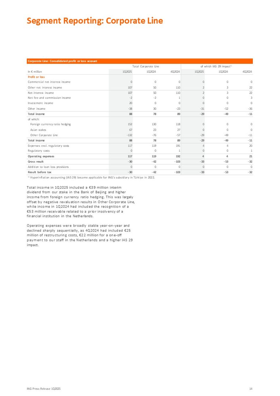 Segment Reporting: Wholesale Banking ING Press Release 1Q2025 14 Corporate Line: Consolidated profit or loss account of which IAS 29 impact 1) Total Corporate Line 4Q2024 1Q2024 1Q2025 4Q2024 1Q2024 1Q2025 In € million Profit or loss 0 0 0 0 0 0 Commercial net interest income 22 3 2 110 50 107 Other net interest income 22 3 2 110 50 107 Net interest income 3 0 0 1 - 2 - 2 Net fee and commission income 0 0 0 0 0 20 Investment income - 36 - 52 - 31 - 23 30 - 38 Other income - 11 - 49 - 29 89 78 88 Total income of which: 0 0 0 118 130 152 Foreign currency ratio hedging 0 0 0 27 23 67 Asian stakes - 11 - 49 - 29 - 57 - 76 - 132 Other Corporate Line - 11 - 49 - 29 89 78 88 Total income 20 4 4 191 119 117 Expenses excl. regulatory costs 1 0 0 1 0 0 Regulatory costs 21 4 4 192 119 117 Operating expenses - 32 - 53 - 33 - 103 - 42 - 30 Gross result 0 0 0 0 0 0 Addition to loan loss provisions - 32 - 53 - 33 - 103 - 42 - 30 Result before tax 1) Hyperinflation accounting (IAS 29) became applicable for ING’s subsidiary in Türkiye in 2022. Total income in 1Q2025 included a €39 million interim dividend from our stake in the Bank of Beijing and higher income from foreign currency ratio hedging. This was largely offset by negative revaluation results in Other Corporate Line, while income in 1Q2024 had included the recognition of a €53 million receivable related to a prior insolvency of a financial institution in the Netherlands. Operating expenses were broadly stable year - on - year and declined sharply sequentially, as 4Q2024 had included €25 million of restructuring costs, €22 million for a one - off payment to our staff in the Netherlands and a higher IAS 29 impact. Segment Reporting: Corporate Line ING Press Release 1Q2025 15 commercial net interest income and net core lending and deposits growth.