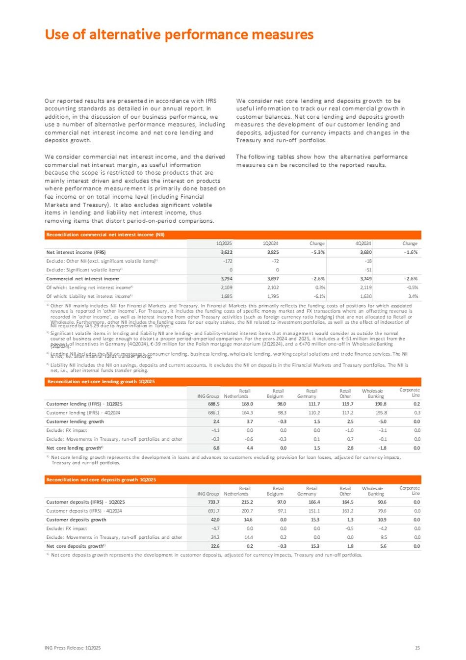 Our reported results are presented in accordance with IFRS We consider net core lending and deposits growth to be accounting standards as detailed in our annual report. In useful information to track our real commercial growth in addition, in the discussion of our business performance, we customer balances. Net core lending and deposits growth use a number of alternative performance measures, including measures the development of our customer lending and commercial net interest margin, as useful information because the scope is restricted to those products that are mainly interest driven and excludes the interest on products where performance measurement is primarily done based on fee income or on total income level (including Financial Markets and Treasury). It also excludes significant volatile items in lending and liability net interest income, thus removing items that distort period - on - period comparisons. We consider commercial net interest income, and the derived The following tables show how the alternative performance deposits, adjusted for currency impacts and changes in the Treasury and run - off portfolios. measures can be reconciled to the reported results. Reconciliation commercial net interest income (NII) Change 4Q2024 Change 1Q2024 1Q2025 - 1.6% 3,680 - 5.3% 3,825 3,622 Net interest income (IFRS) - 18 - 51 - 72 0 - 172 0 Exclude: Other NII (excl. significant volatile items) 1) Exclude: Significant volatile items 2) - 2.6% 3,749 - 2.6% 3,897 3,794 Commercial net interest income - 0.5% 2,119 0.3% 2,102 2,109 Of which: Lending net interest income 3) 3.4% 1,630 - 6.1% 1,795 1,685 Of which: Liability net interest income 4) NII required by IAS 29 due to hyperinflation in Türkiye. (2Q2024). is net, i.e. after internal funds transfer pricing. 1 ) Other NII mainly includes NII for Financial Markets and Treasury . In Financial Markets this primarily reflects the funding costs of positions for which associated revenue is reported in 'other income' . For Treasury, it includes the funding costs of specific money market and FX transactions where an offsetting revenue is recorded in 'other income', as well as interest income from other Treasury activities (such as foreign currency ratio hedging) that are not allocated to Retail or Wholesale . Furthermore, other NII includes the funding costs for our equity stakes, the NII related to investment portfolios, as well as the effect of indexation of 2) Significant volatile items in lending and liability NII are lending - and liability - related interest items that management would consider as outside the normal course of business and large enough to distort a proper period - on - period comparison. For the years 2024 and 2025, it includes a € - 51 million impact from the pay - out of incentives in Germany (4Q2024), € - 39 million for the Polish mortgage moratorium (2Q2024), and a €+70 million one - off in Wholesale Banking 3) Lending NII includes the NII on mortgages, consumer lending, business lending, wholesale lending, working capital solutions and trade finance services. The NII 4) Liability NII includes the NII on savings, deposits and current accounts. It excludes the NII on deposits in the Financial Markets and Treasury portfolios. The NII is net, i.e., after internal funds transfer pricing. Reconciliation net core lending growth 1Q2025 Corporate Line Wholesale Banking Retail Other Retail Germany Retail Belgium Retail Netherlands ING Group 0.2 190.8 119.7 111.7 98.0 168.0 688.5 Customer lending (IFRS) - 1Q2025 0.3 195.8 117.2 110.2 98.3 164.3 686.1 Customer lending (IFRS) - 4Q2024 0.0 - 5.0 2.5 1.5 - 0.3 3.7 2.4 Customer lending growth 0.0 - 3.1 - 1.0 0.0 0.0 0.0 - 4.1 Exclude: FX impact 0.0 - 0.1 0.7 0.1 - 0.3 - 0.6 - 0.3 Exclude: Movements in Treasury, run - off portfolios and other 0.0 - 1.8 2.8 1.5 0.0 4.4 6.8 Net core lending growth 1) 1) Net core lending growth represents the development in loans and advances to customers excluding provision for loan losses, adjusted for currency impacts, Treasury and run - off portfolios. Reconciliation net core deposits growth 1Q2025 Corporate Line Wholesale Banking Retail Other Retail Germany Retail Belgium Retail Netherlands ING Group 0.0 90.6 164.5 166.4 97.0 215.2 733.7 Customer deposits (IFRS) - 1Q2025 0.0 79.6 163.2 151.1 97.1 200.7 691.7 Customer deposits (IFRS) - 4Q2024 0.0 10.9 1.3 15.3 0.0 14.6 42.0 Customer deposits growth 0.0 - 4.2 - 0.5 0.0 0.0 0.0 - 4.7 Exclude: FX impact 0.0 9.5 0.0 0.0 0.2 14.4 24.2 Exclude: Movements in Treasury, run - off portfolios and other 0.0 5.6 1.8 15.3 - 0.3 0.2 22.6 Net core deposits growth 1) 1) Net core deposits growth represents the development in customer deposits, adjusted for currency impacts, Treasury and run - off portfolios.