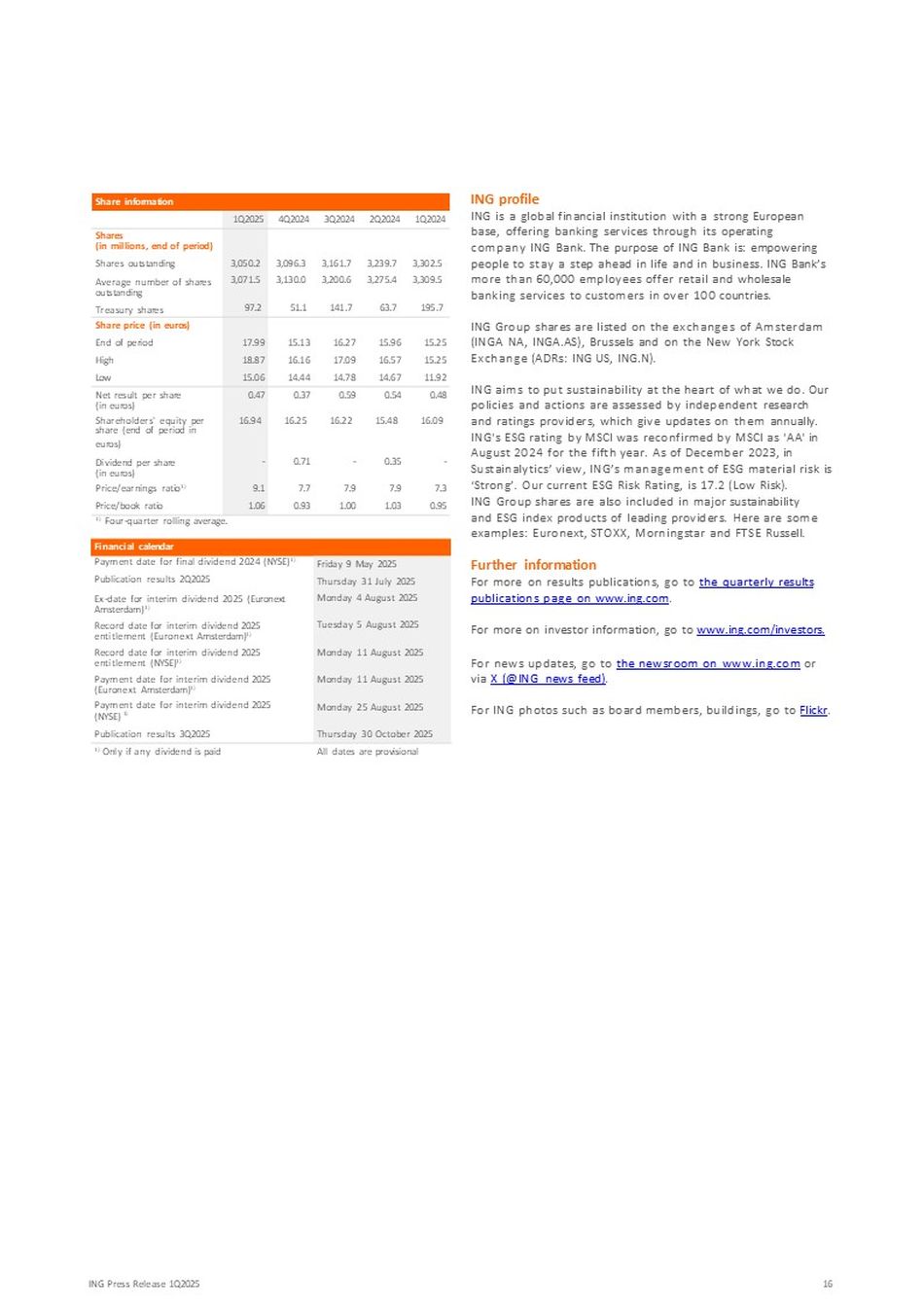 Use of alternative performance measures Share information 1Q2024 2Q2024 3Q2024 4Q2024 1Q2025 3,302.5 3,309.5 195.7 3,239.7 3,275.4 63.7 3,161.7 3,200.6 141.7 3,096.3 3,130.0 51.1 3,050.2 3,071.5 97.2 Shares (in millions, end of period) Shares outstanding Average number of shares outstanding Treasury shares Share price (in euros) 15.25 15.96 16.27 15.13 17.99 End of period 15.25 16.57 17.09 16.16 18.87 High 11.92 14.67 14.78 14.44 15.06 Low 0.48 0.54 0.59 0.37 0.47 Net result per share (in euros) 16.09 15.48 16.22 16.25 16.94 Shareholders' equity per share (end of period in euros) - 0.35 - 0.71 - Dividend per share (in euros) 7.3 7.9 7.9 7.7 9.1 Price/earnings ratio 1) 0.95 1.03 1.00 0.93 1.06 Price/book ratio 1) Four - quarter rolling average. Financial calendar Payment date for final dividend 2024 (NYSE) 1) Publication results 2Q2025 Friday 9 May 2025 Thursday 31 July 2025 Monday 4 August 2025 Tuesday 5 August 2025 Monday 11 August 2025 Monday 11 August 2025 Monday 25 August 2025 Thursday 30 October 2025 Ex - date for interim dividend 2025 (Euronext Amsterdam) 1) Record date for interim dividend 2025 entitlement (Euronext Amsterdam) 1) Record date for interim dividend 2025 entitlement (NYSE) 1) Payment date for interim dividend 2025 (Euronext Amsterdam) 1) Payment date for interim dividend 2025 1) (NYSE) Publication results 3Q2025 1) Only if any dividend is paid All dates are provisional ING profile ING is a global financial institution with a strong European base, offering banking services through its operating company ING Bank. The purpose of ING Bank is: empowering people to stay a step ahead in life and in business. ING Bank’s more than 60,000 employees offer retail and wholesale banking services to customers in over 100 countries. ING Group shares are listed on the exchanges of Amsterdam (INGA NA, INGA.AS), Brussels and on the New York Stock Exchange (ADRs: ING US, ING.N). ING aims to put sustainability at the heart of what we do. Our policies and actions are assessed by independent research and ratings providers, which give updates on them annually. ING's ESG rating by MSCI was reconfirmed by MSCI as 'AA' in August 2024 for the fifth year. As of December 2023, in Sustainalytics’ view, ING’s management of ESG material risk is ‘Strong’. Our current ESG Risk Rating, is 17.2 (Low Risk). ING Group shares are also included in major sustainability and ESG index products of leading providers. Here are some examples: Euronext, STOXX, Morningstar and FTSE Russell. Further information For more on results publications, go to the quarterly results publications page on www.ing.com . For more on investor information, go to www.ing.com/investors . ING Press Release 1Q2025 16 For news updates, go to the newsroom on www.ing.com or via X (@ING_news feed) . For ING photos such as board members, buildings, go to Flickr .