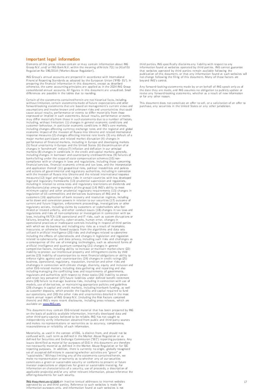ING Press Release 1Q2025 17 Important legal information Elements of this press release contain or may contain information about ING Groep N.V. and/ or ING Bank N.V. within the meaning of Article 7(1) to (4) of EU Regulation No 596/2014 (‘Market Abuse Regulation’). ING Group’s annual accounts are prepared in accordance with International Financial Reporting Standards as adopted by the European Union (‘IFRS - EU’). In preparing the financial information in this document, except as described otherwise, the same accounting principles are applied as in the 2024 ING Group consolidated annual accounts. All figures in this document are unaudited. Small differences are possible in the tables due to rounding. Certain of the statements contained herein are not historical facts, including, without limitation, certain statements made of future expectations and other forward - looking statements that are based on management’s current views and assumptions and involve known and unknown risks and uncertainties that could cause actual results, performance or events to differ materially from those expressed or implied in such statements. Actual results, performance or events may differ materially from those in such statements due to a number of factors, including, without limitation: (1) changes in general economic conditions and customer behaviour, in particular economic conditions in ING’s core markets, including changes affecting currency exchange rates and the regional and global economic impact of the invasion of Russia into Ukraine and related international response measures (2) changes affecting interest rate levels (3) any default of a major market participant and related market disruption (4) changes in performance of financial markets, including in Europe and developing markets (5) fiscal uncertainty in Europe and the United States (6) discontinuation of or changes in ‘benchmark’ indices (7) inflation and deflation in our principal markets (8) changes in conditions in the credit and capital markets generally, including changes in borrower and counterparty creditworthiness (9) failures of banks falling under the scope of state compensation schemes (10) non - compliance with or changes in laws and regulations, including those concerning financial services, financial economic crimes and tax laws, and the interpretation and application thereof (11) geopolitical risks, political instabilities and policies and actions of governmental and regulatory authorities, including in connection with the invasion of Russia into Ukraine and the related international response measures (12) legal and regulatory risks in certain countries with less developed legal and regulatory frameworks (13) prudential supervision and regulations, including in relation to stress tests and regulatory restrictions on dividends and distributions (also among members of the group) (14) ING’s ability to meet minimum capital and other prudential regulatory requirements (15) changes in regulation of US commodities and derivatives businesses of ING and its customers (16) application of bank recovery and resolution regimes, including write down and conversion powers in relation to our securities (17) outcome of current and future litigation, enforcement proceedings, investigations or other regulatory actions, including claims by customers or stakeholders who feel misled or treated unfairly, and other conduct issues (18) changes in tax laws and regulations and risks of non - compliance or investigation in connection with tax laws, including FATCA (19) operational and IT risks, such as system disruptions or failures, breaches of security, cyber - attacks, human error, changes in operational practices or inadequate controls including in respect of third parties with which we do business and including any risks as a result of incomplete, inaccurate, or otherwise flawed outputs from the algorithms and data sets utilized in artificial intelligence (20) risks and challenges related to cybercrime including the effects of cyberattacks and changes in legislation and regulation related to cybersecurity and data privacy, including such risks and challenges as a consequence of the use of emerging technologies, such as advanced forms of artificial intelligence and quantum computing (21) changes in general competitive factors, including ability to increase or maintain market share (22) inability to protect our intellectual property and infringement claims by third parties (23) inability of counterparties to meet financial obligations or ability to enforce rights against such counterparties (24) changes in credit ratings (25) business, operational, regulatory, reputation, transition and other risks and challenges in connection with climate change, diversity, equity and inclusion and other ESG - related matters, including data gathering and reporting and also including managing the conflicting laws and requirements of governments, regulators and authorities with respect to these topics (26) inability to attract and retain key personnel (27) future liabilities under defined benefit retirement plans (28) failure to manage business risks, including in connection with use of models, use of derivatives, or maintaining appropriate policies and guidelines (29) changes in capital and credit markets, including interbank funding, as well as customer deposits, which provide the liquidity and capital required to fund our operations, and (30) the other risks and uncertainties detailed in the most recent annual report of ING Groep N.V. (including the Risk Factors contained therein) and ING’s more recent disclosures, including press releases, which are available on www.ING.com. This document may contain ESG - related material that has been prepared by ING on the basis of publicly available information, internally developed data and other third - party sources believed to be reliable. ING has not sought to independently verify information obtained fr