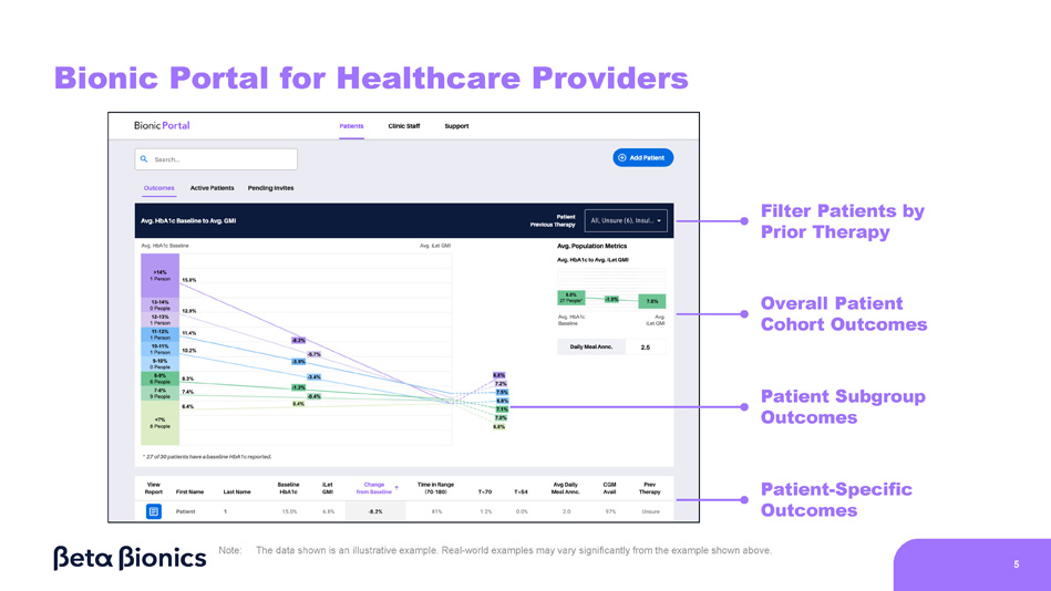 Steven Russell, Chief Medical Officer • Sean Saint, Chief Executive Officer • Mike Mensinger, Chief Product Officer Event Agenda 1 2 5 4 3 4 Commercial Updates Q&A Adaptive - Closed Loop Algorithm Overview iLet Real - World Evidence Patch Pump Demonstration Presenters • Stephen Feider, Chief Financial Officer • Mark Hopman, Chief Commercial Officer • All Presenters • Sean Saint, Chief Executive Officer • Sean Saint, Chief Executive Officer • Dr. Steven Russell, Chief Medical Officer • Sean Saint, Chief Executive Officer • Mike Mensinger, Chief Product Officer Bionic Portal for Healthcare Providers Filter Patients by Prior Therapy Overall Patient Cohort Outcomes Patient Subgroup Outcomes Patient - Specific Outcomes Note: 5 The data shown is an illustrative example.