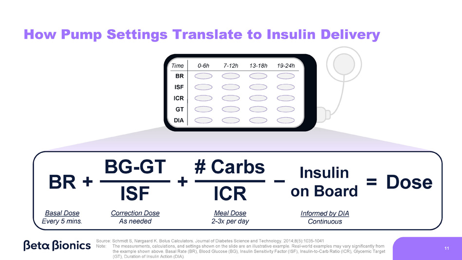 ISF Correction Dose As needed ICR Meal Dose 2 - 3x per day BG - GT # Carbs BR + + Insulin on Board Informed by DIA Continuous = Dose Source: Schmidt S, Nørgaard K. Bolus Calculators. Journal of Diabetes Science and Technology. 2014;8(5):1035 - 1041 Note: The measurements, calculations, and settings shown on the slide are an illustrative example . Real - world examples may vary significantly from the example shown above . Basal Rate (BR), Blood Glucose (BG), Insulin Sensitivity Factor (ISF), Insulin - to - Carb Ratio (ICR), Glycemic Target (GT), Duration of Insulin Action (DIA) .
