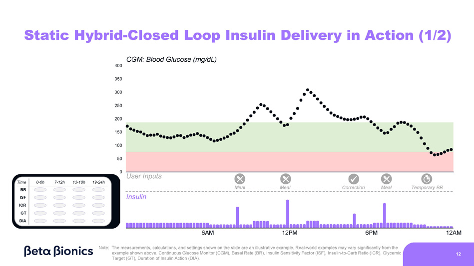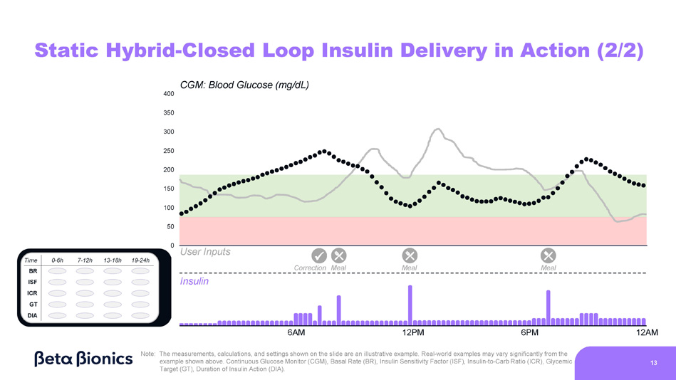 0 CGM: Blood Glucose (mg/dL) 400 350 300 250 200 150 100 50 Static Hybrid - Closed Loop Insulin Delivery in Action (1/2) Insulin User Inputs x Meal Correction Temporary BR Meal Meal 6AM 12PM 6PM 12AM Note: The measurements, calculations, and settings shown on the slide are an illustrative example. Real - world examples may vary significantly from the example shown above. Continuous Glucose Monitor (CGM), Basal Rate (BR), Insulin Sensitivity Factor (ISF), Insulin - to - Carb Ratio (ICR), Glycemic Target (GT), Duration of Insulin Action (DIA). 12 0 Static Hybrid - Closed Loop Insulin Delivery in Action (2/2) Insulin User Inputs x CGM: Blood Glucose (mg/dL) 400 350 300 250 200 150 100 50 Meal Meal Correction Meal 6AM 12PM 6PM 12AM Note: The measurements, calculations, and settings shown on the slide are an illustrative example.