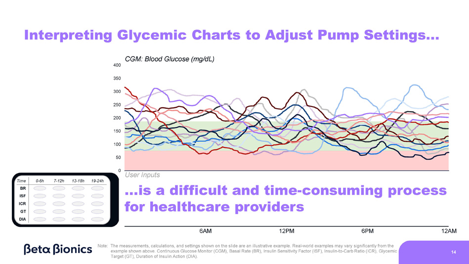 Real - world examples may vary significantly from the example shown above. Continuous Glucose Monitor (CGM), Basal Rate (BR), Insulin Sensitivity Factor (ISF), Insulin - to - Carb Ratio (ICR), Glycemic Target (GT), Duration of Insulin Action (DIA). 13 0 Interpreting Glycemic Charts to Adjust Pump Settings… Insulin CGM: Blood Glucose (mg/dL) 400 350 300 250 200 150 100 50 User Inputs …is a difficult and time - consuming process for healthcare providers 6AM 12PM 6PM 12AM Note: The measurements, calculations, and settings shown on the slide are an illustrative example.
