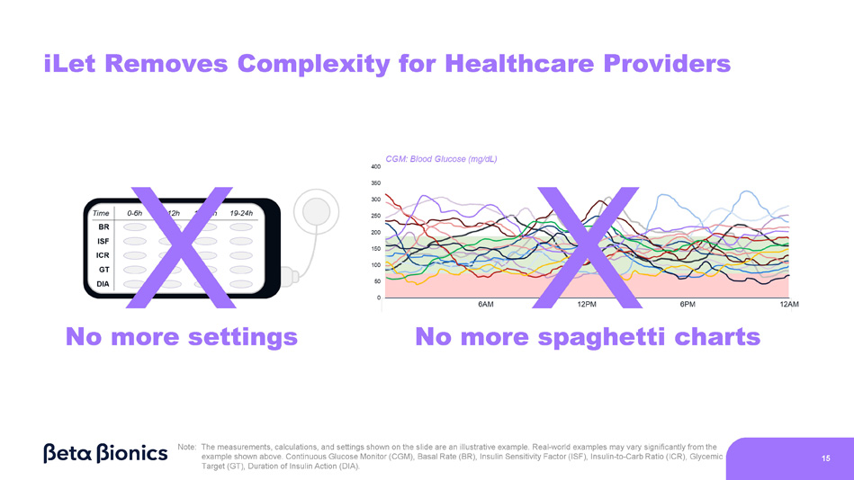 Real - world examples may vary significantly from the example shown above. Continuous Glucose Monitor (CGM), Basal Rate (BR), Insulin Sensitivity Factor (ISF), Insulin - to - Carb Ratio (ICR), Glycemic Target (GT), Duration of Insulin Action (DIA). 14 X X No more settings No more spaghetti charts Note: The measurements, calculations, and settings shown on the slide are an illustrative example.