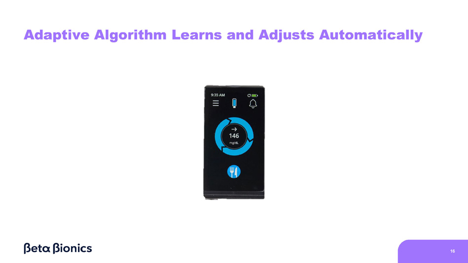 Real - world examples may vary significantly from the example shown above. Continuous Glucose Monitor (CGM), Basal Rate (BR), Insulin Sensitivity Factor (ISF), Insulin - to - Carb Ratio (ICR), Glycemic Target (GT), Duration of Insulin Action (DIA). 15 iLet Removes Complexity for Healthcare Providers 16 Adaptive Algorithm Learns and Adjusts Automatically