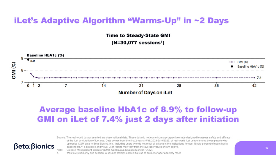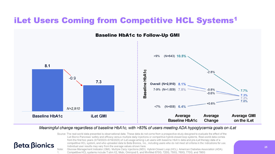 24 Meaningful change regardless of baseline HbA1c, with >85% of users meeting ADA hypoglycemia goals on iLet Source: The real - world data presented is observational data. These data do not come from a prospective study designed to evaluate the effect of the iLet Bionic Pancreas’ safety and efficacy versus multiple daily injections or competitive hybrid - closed loop systems. Real - world data comes from the first two years (5/19/2023 – 5/18/2025) of iLet usage among iLet users with baseline HbA1c data and pre - iLet therapy data of MDI, and who uploaded data to Beta Bionics, Inc., including users who do not meet all criteria in the Indications for use. Individual user results may vary from the average values shown here. Note: Glucose Management Indicator (GMI). Multiple Daily Injections (MDI). American Diabetes Association (ADA). iLet Users Coming from MDI 9.2 7.3 Baseline HbA1c iLet GMI - 1.9 Baseline HbA1c to Follow - Up GMI Baseline HbA1c Average Baseline HbA1c Average Change Average GMI on the iLet 8.0% 9.2% >9% (N=4,014) 11.0% 7 - 9% (N=3,881) Overall (N=8,802) <7% (N=907) 6.4% 7.6% 7.3% 7.2% 7.0% - 3.5% - 1.9% - 0.8% +0.6% N=8,802 6.4% 8.1% 7.8% >9% (N=643) 10.5% Overall (N=2,910) 7 - 9% (N=1,609) <7% (N=658) - 2.8% - 0.8% - 0.6% +0.6% 8.1 7.3 Baseline HbA1c iLet GMI 25 iLet Users Coming from Competitive HCL Systems 1 7.7% 7.3% 7.2% 7.0% Baseline HbA1c to Follow - Up GMI Note: Glucose Management Indicator (GMI).