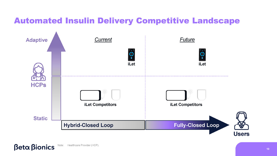 18 Adaptive Algorithm Enables PCPs to Treat with iLet - 1.6% Patients treated by Endocrinologists - 1.6% Patients treated by Primary Care Providers Source: The real - world data presented is observational data. These data do not come from a prospective study designed to evaluate the effect of the iLet Bionic Pancreas in subgroups by provider practice type. Real - world data comes from the first two years (5/19/2023 – 5/18/2025) of iLet usage among iLet users with baseline HbA1c data and provider practice type data from Symphony Health Solutions and the Centers for Medicare & Medicaid Services’ National Plan and Provider Enumeration System, and who uploaded data to Beta Bionics, Inc., including users who do not meet all criteria in the Indications for use. Individual user results may vary from the average values shown here. Note: Glucose Management Indicator (GMI). Primary Care Provider (PCP). N=13,566 N=1,036 Baseline HbA1c to Follow - Up GMI Reduction on iLet Automated Insulin Delivery Competitive Landscape Users Hybrid - Closed Loop Fully - Closed Loop Static Adaptive HCPs iLet Competitors iLet Competitors iLet iLet 19 Current Future Note: Healthcare Provider (HCP).