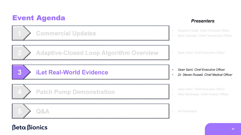 Event Agenda 1 2 5 4 3 3 Commercial Updates Q&A Adaptive - Closed Loop Algorithm Overview iLet Real - World Evidence Patch Pump Demonstration Presenters • Stephen Feider, Chief Financial Officer • Mark Hopman, Chief Commercial Officer • All Presenters • Sean Saint, Chief Executive Officer • Sean Saint, Chief Executive Officer • Dr.