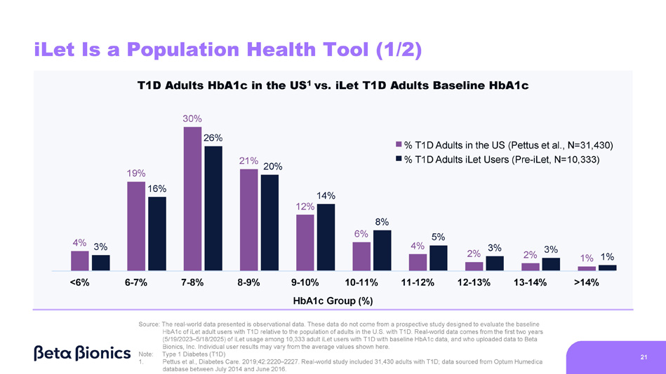Steven Russell, Chief Medical Officer • Sean Saint, Chief Executive Officer • Mike Mensinger, Chief Product Officer 4% 19% 12% 6% 4% 2% 2% 1% <6% 6 - 7% 7 - 8% 8 - 9% 11 - 12% 12 - 13% 13 - 14% >14% 3% 16% 26% 21% 20% 14% 8% 5% 3% 3% 1% T1D Adults HbA1c in the US 1 vs. iLet T1D Adults Baseline HbA1c 30% 9 - 10% 10 - 11% HbA1c Group (%) iLet Is a Population Health Tool (1/2) 21 % T1D Adults in the US (Pettus et al., N=31,430) % T1D Adults iLet Users (Pre - iLet, N=10,333) Source: The real - world data presented is observational data. These data do not come from a prospective study designed to evaluate the baseline HbA1c of iLet adult users with T1D relative to the population of adults in the U.S. with T1D. Real - world data comes from the first two years (5/19/2023 – 5/18/2025) of iLet usage among 10,333 adult iLet users with T1D with baseline HbA1c data, and who uploaded data to Beta Bionics, Inc. Individual user results may vary from the average values shown here. Note: Type 1 Diabetes (T1D) 1. Pettus et al., Diabetes Care. 2019;42:2220 – 2227. Real - world study included 31,430 adults with T1D; data sourced from Optum Humedica database between July 2014 and June 2016.
