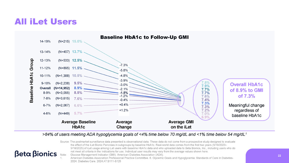 Multiple Daily Injections (MDI). Hybrid - Closed Loop (HCL). American Diabetes Association (ADA). 1. Competitive HCL systems include T:slim X2, Mobi, Omnipod 5, and MiniMed 670G, 720G, 750G, 760G, 770G, and 780G Meaningful change regardless of baseline HbA1c, with >83% of users meeting ADA hypoglycemia goals on iLet Source: The real - world data presented is observational data. These data do not come from a prospective study designed to evaluate the effect of the iLet Bionic Pancreas’ safety and efficacy versus multiple daily injections or competitive hybrid - closed loop systems. Real - world data comes from the first two years (5/19/2023 – 5/18/2025) of iLet usage among iLet users with baseline HbA1c data and pre - iLet therapy data of a competitive HCL system, and who uploaded data to Beta Bionics, Inc., including users who do not meet all criteria in the Indications for use. Individual user results may vary from the average values shown here.