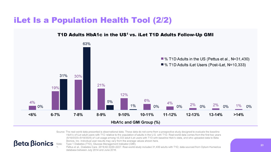 All iLet Users 22 Baseline HbA1c Group Average Baseline HbA1c Average Change Average GMI on the iLet 15.0% (N=215) 14 - 19% 13.7% (N=457) 13 - 14% 12.5% (N=533) 12 - 13% 11.5% (N=895) 11 - 12% 10.5% (N=1,388) 10 - 11% 9.5% (N=2,238) 9 - 10% 8.9% (N=14,952) Overall 8.5% (N=3,095) 8 - 9% 7.6% (N=3,615) 7 - 8% 6.6% (N=2,067) 6 - 7% 5.7% (N=449) 4 - 6% Overall HbA1c of 8.9% to GMI of 7.3% Meaningful change regardless of baseline HbA1c Note: Glucose Management Indicator (GMI). American Diabetes Association (ADA). 1. American Diabetes Association Professional Practice Committee. 6. Glycemic Goals and Hypoglycemia: Standards of Care in Diabetes - 2024. Diabetes Care. 2024;47:S111 - S125 >84% of users meeting ADA hypoglycemia goals of <4% time below 70 mg/dL and <1% time below 54 mg/dL 1 Source: The postmarket surveillance data presented is observational data. These data do not come from a prospective study designed to evaluate the effect of the iLet Bionic Pancreas in subgroups by baseline HbA1c. Real - world data comes from the first two years (5/19/2023 – 5/18/2025) of iLet usage among iLet users with baseline HbA1c data and who uploaded data to Beta Bionics, Inc., including users who do not meet all criteria in the Indications for use. Individual user results may vary from the average values shown here.
