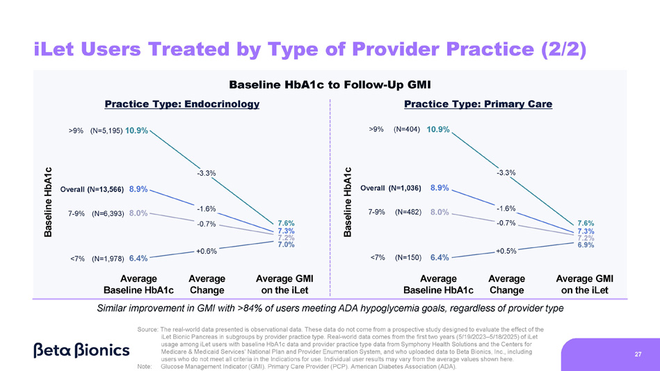 - 0.9 Baseline HbA1c Average Baseline HbA1c Average Change Average GMI on the iLet N=2,910 7.3 - 1.6 iLet Users Treated by Type of Provider Practice (1/2) Baseline HbA1c to Follow - Up GMI Practice Type: Primary Care 8.9 Practice Type: Endocrinology 8.9 7.3 - 1.6 N=13,566 N=1,036 Baseline HbA1c iLet GMI Baseline HbA1c iLet GMI Similar improvement in GMI with >84% of users meeting ADA hypoglycemia goals, regardless of provider practice type Source: The real - world data presented is observational data. These data do not come from a prospective study designed to evaluate the effect of the iLet Bionic Pancreas in subgroups by provider practice type. Real - world data comes from the first two years (5/19/2023 – 5/18/2025) of iLet usage among iLet users with baseline HbA1c data and provider practice type data from Symphony Health Solutions and the Centers for Medicare & Medicaid Services’ National Plan and Provider Enumeration System, and who uploaded data to Beta Bionics, Inc., including users who do not meet all criteria in the Indications for use. Individual user results may vary from the average values shown here. 26 Note: Glucose Management Indicator (GMI). Primary Care Provider (PCP). American Diabetes Association (ADA).