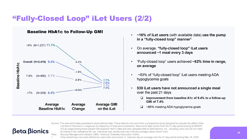 7.5 Baseline HbA1c iLet GMI - 1.9 Baseline HbA1c to Follow - Up GMI 9.4 “Fully - Closed Loop” iLet Users (1/2) • ~16% of iLet users (with available data) use the pump in a “fully - closed loop” manner 1 • On average, “fully - closed loop” iLet users announced ~1 meal every 3 days • “Fully - closed loop” users achieved ~62% time in range, on average • ~83% of “fully - closed loop” iLet users meeting ADA hypoglycemia goals • 530 iLet users have not announced a single meal over the past 21 days □ Improvement from baseline A1c of 9.4% to a follow - up GMI of 7.4% □ ~86% meeting ADA hypoglycemia goals Source: The real - world data presented is observational data. These data do not come from a prospective study designed to evaluate the effect of the iLet Bionic Pancreas in subgroups by frequency of meal announcements. Real - world data comes from the 21 - day period ending 5/18/2025 of iLet usage among those people with baseline HbA1c data and who uploaded data to Beta Bionics, Inc., including users who do not meet all criteria in the Indications for use. Individual user results may vary from the average values shown here. 28 Note: 1. Glucose Management Indicator (GMI). American Diabetes Association (ADA). Fully - closed loop iLet users defined as users who announced <1 meal per day on average over the 21 - day period ending May 18, 2025 N=2,416 “Fully - Closed Loop” iLet Users (2/2) Baseline HbA1c to Follow - Up GMI • ~16% of iLet users (with available data) use the pump in a “fully - closed loop” manner 1 Source: The real - world data presented is observational data.